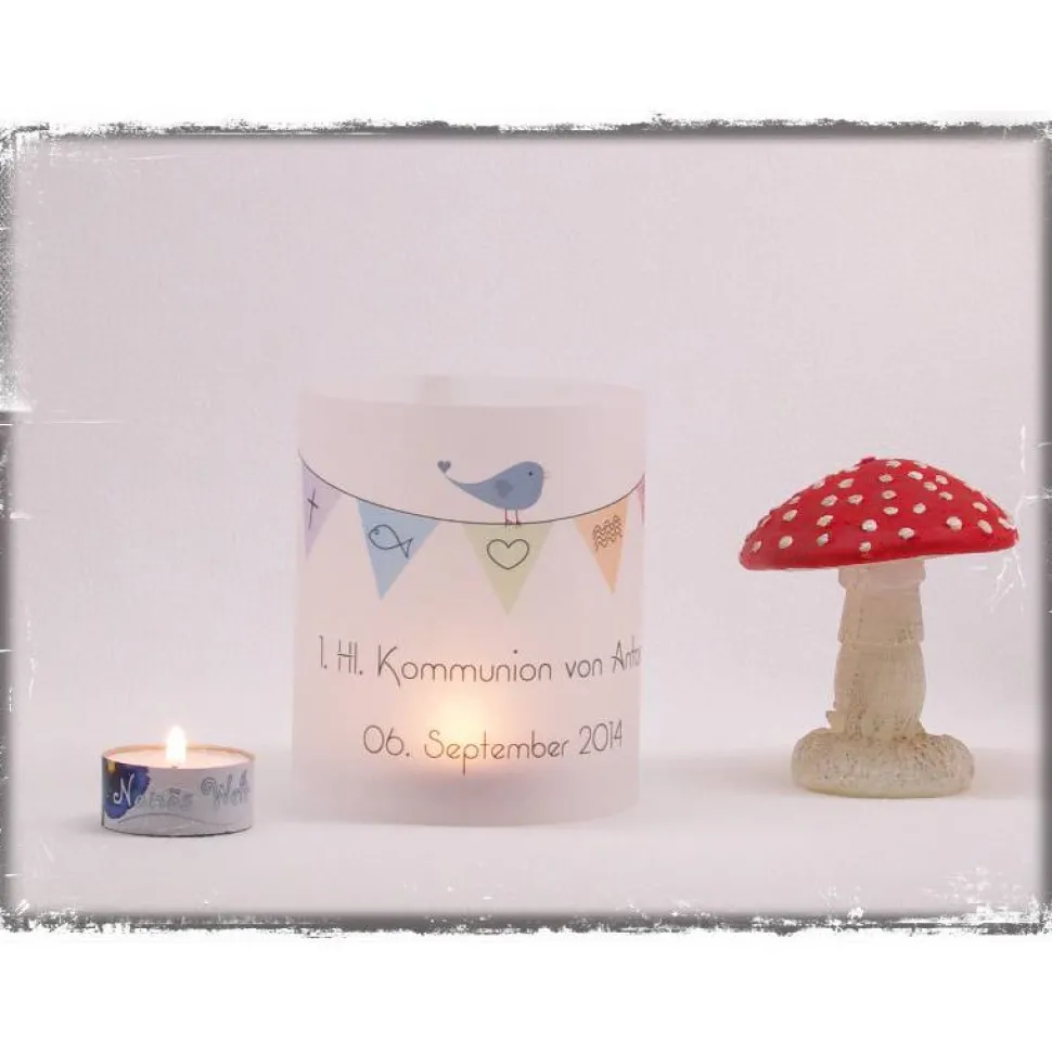 Ein Kommunionlicht / Windlicht mit den christlichen Symbolen Kreuz, Fisch, Herz, Wasser und Taube. Für Jungen hüpft ein süßes blaues Vögelchen auf der Wimpelkette umher. Darunter der Name des Kommunionkinds und das Kommuniondatum.