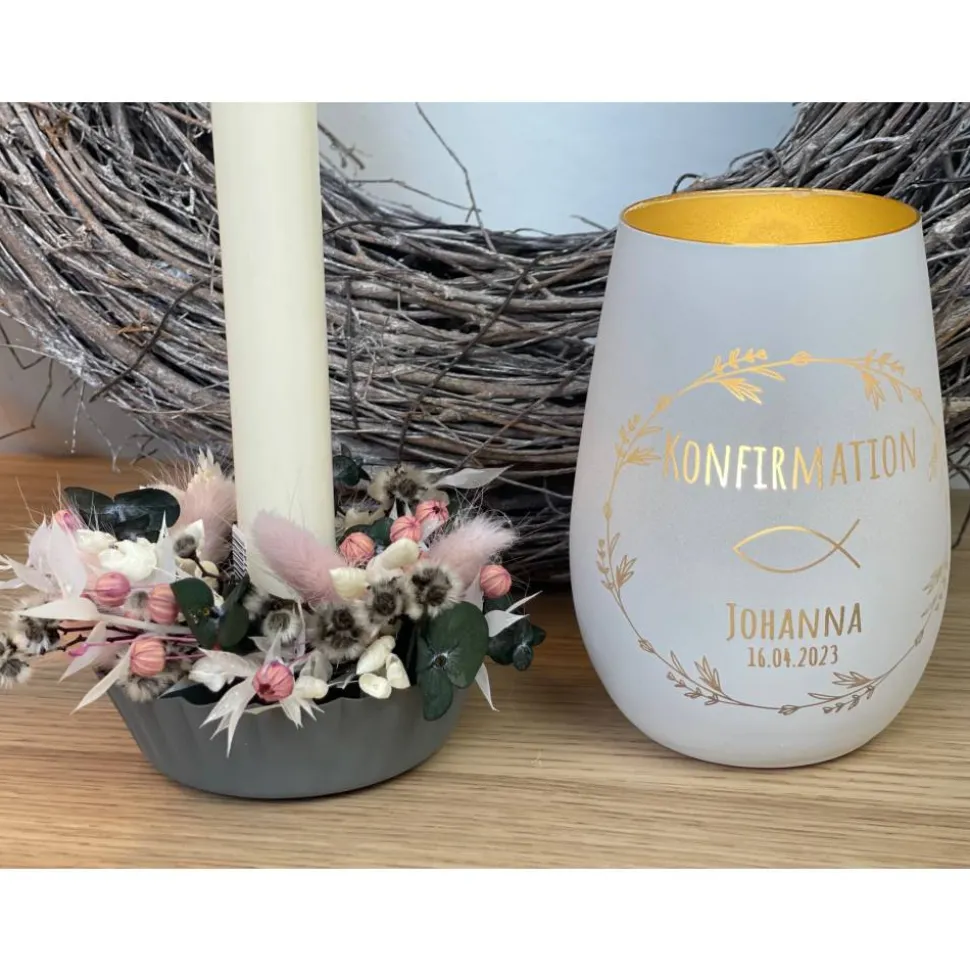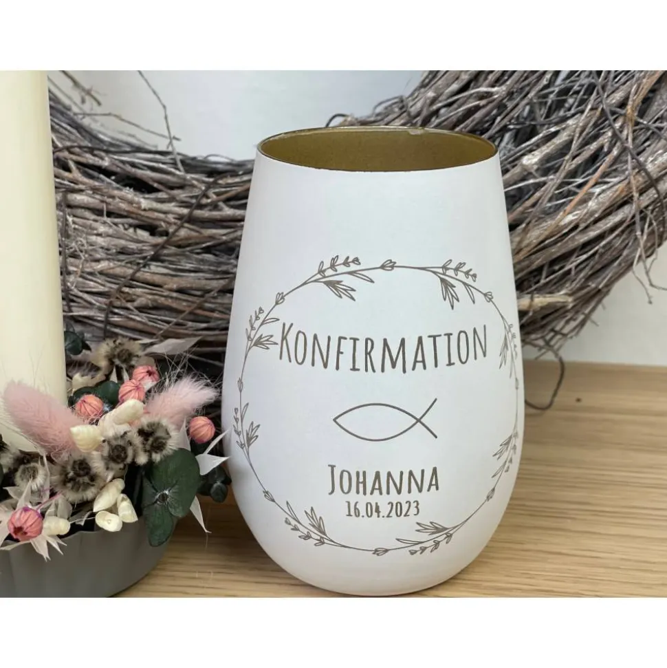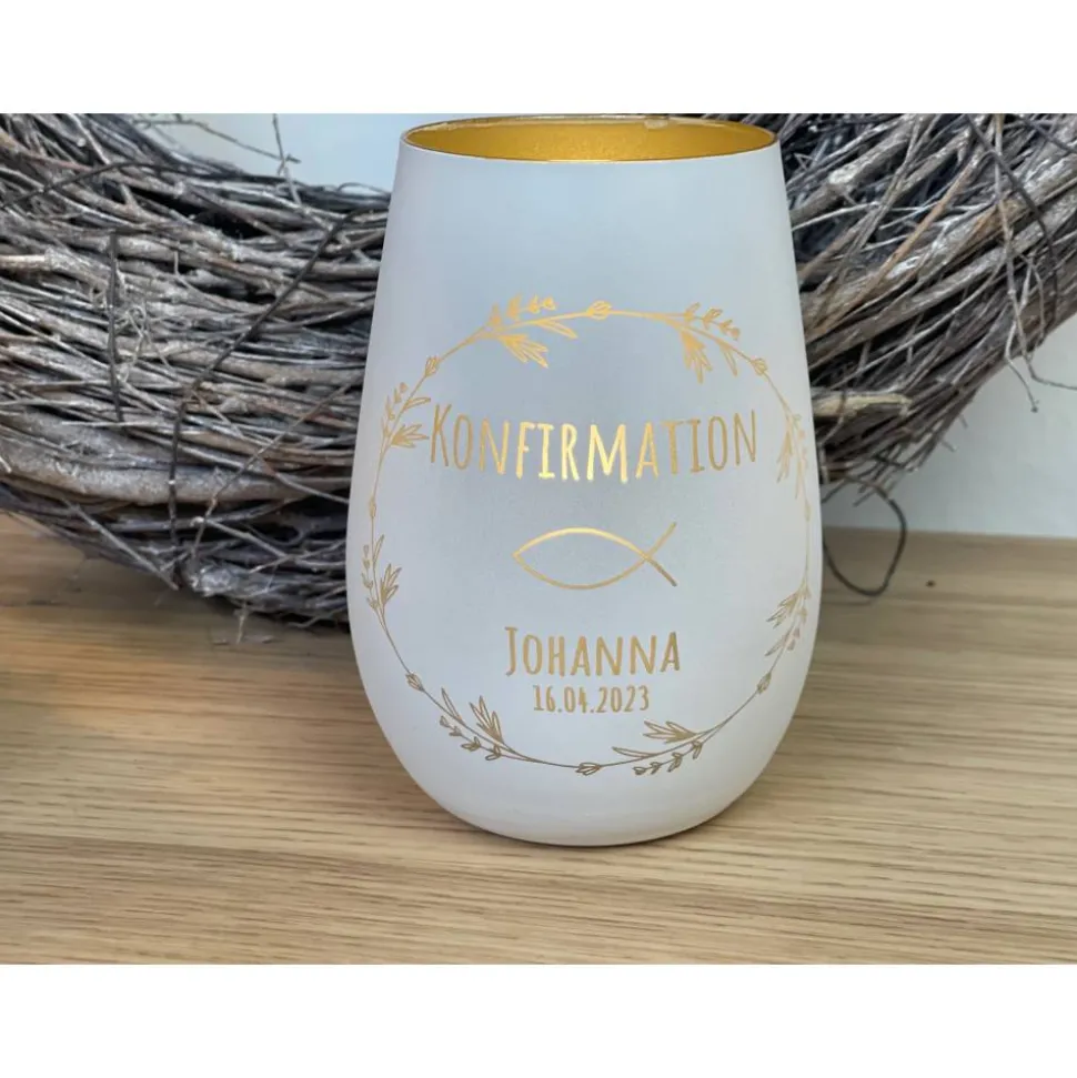 Durch die Gravur schimmert das Kerzenlicht in der gewählten Beschichtung.
