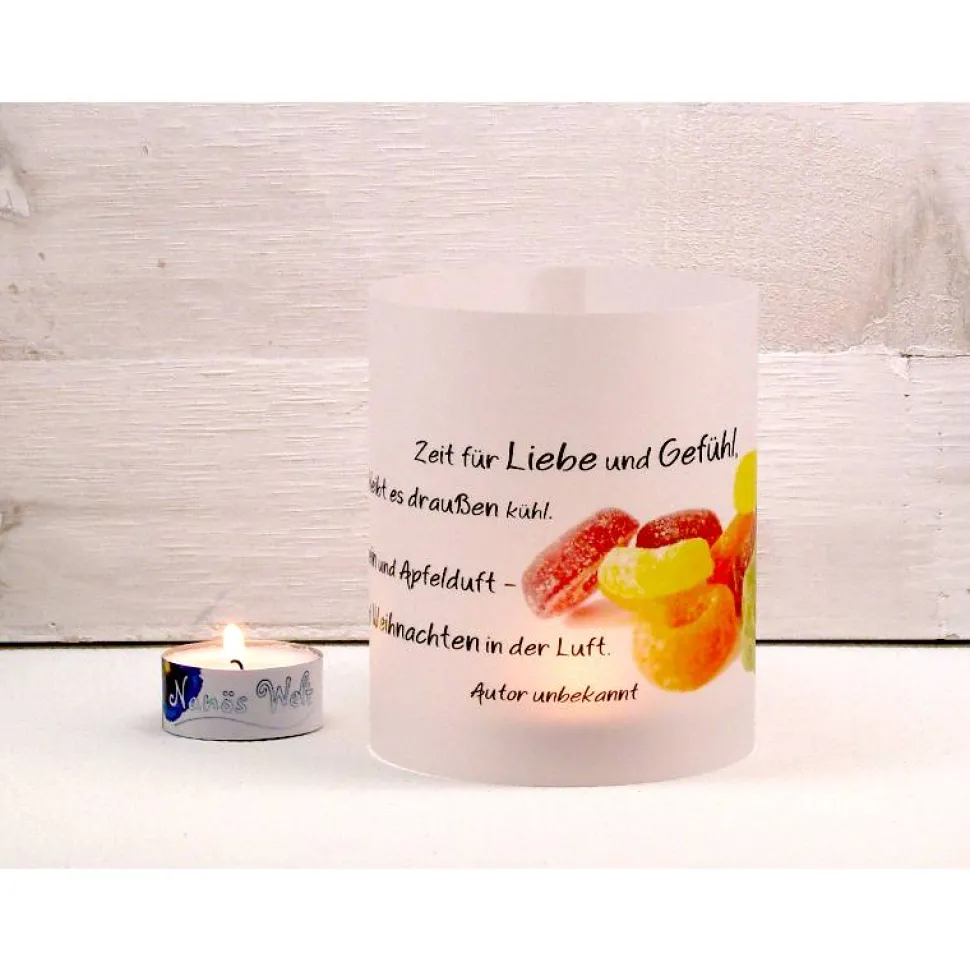 Windlicht:Druck auf Transparentpapier- mit Herz, Hand und Verstand gefertigt.