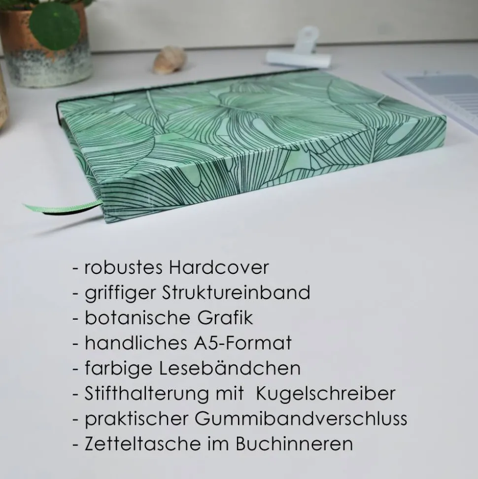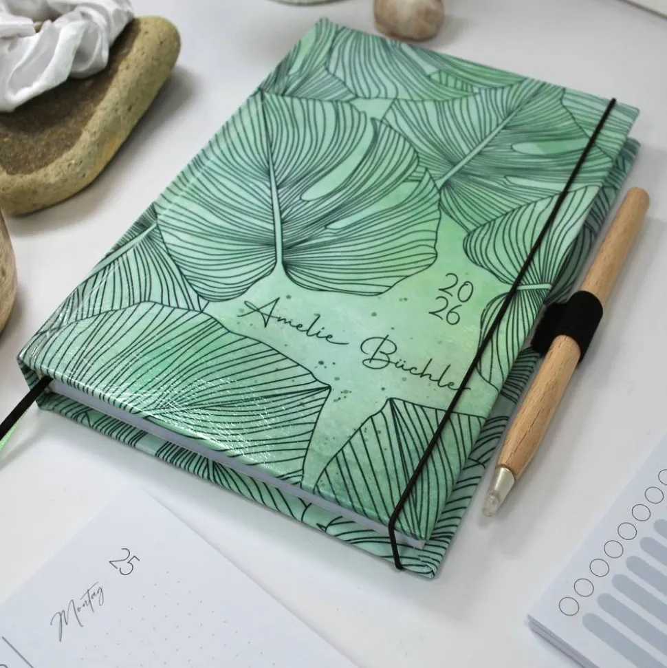 Wochenkalender & Terminplaner 2025 A5 mit vielen Extras personalisiert botanisch Monstera Blätter grün