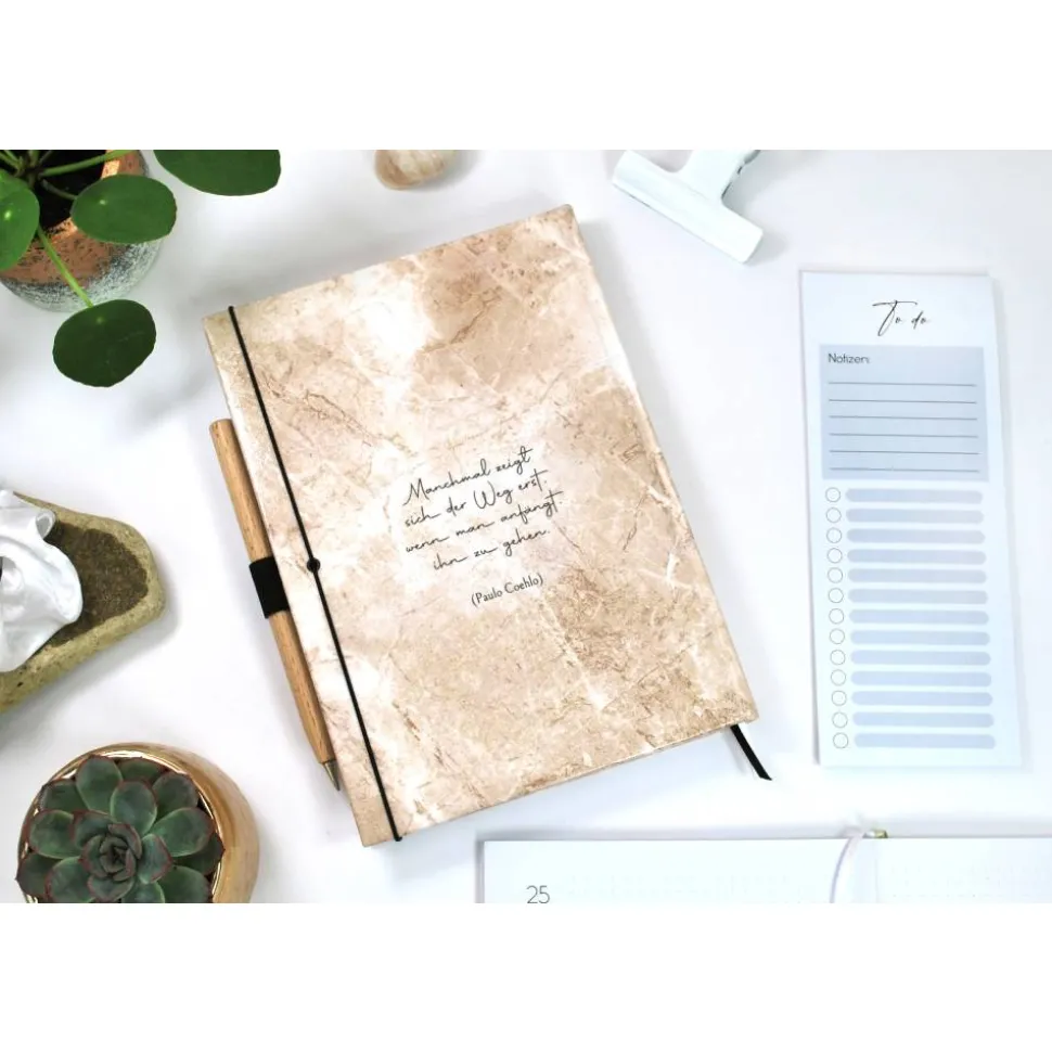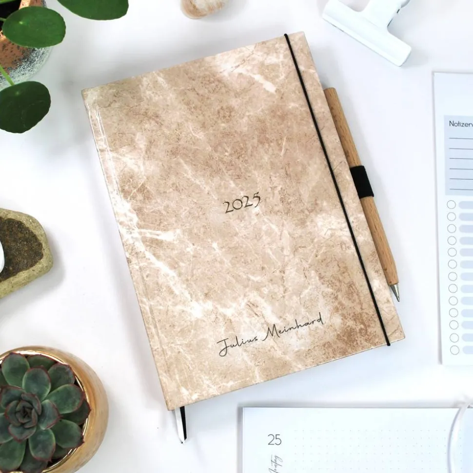 Robuster und durchdachter Jahres- und Tagesplaner in schicker, hellbrauner Lederoptik personalisiert mit Name und frei wählbarem Spruch auf dem Buchcover wahlweise für 2024/25 oder das gesamte Kalenderjahr 2025