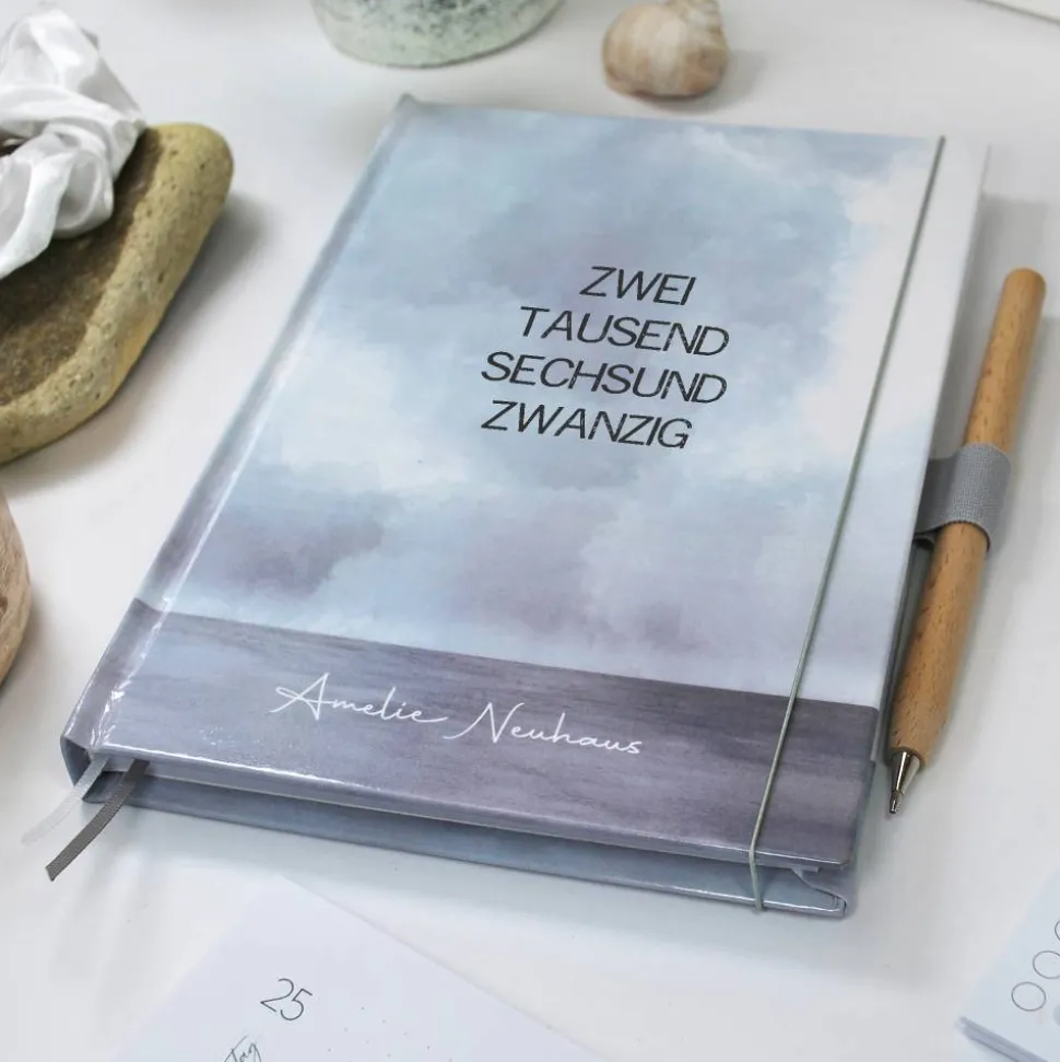 Robuster und durchdachter Jahres- und Tagesplaner mit dem Meer, dem Horizont und Wolkenhimmel in gedeckten Grautönen personalisiert mit Name und frei wählbarem Spruch auf dem Buchcover für das gesamte Kalenderjahr 2026.