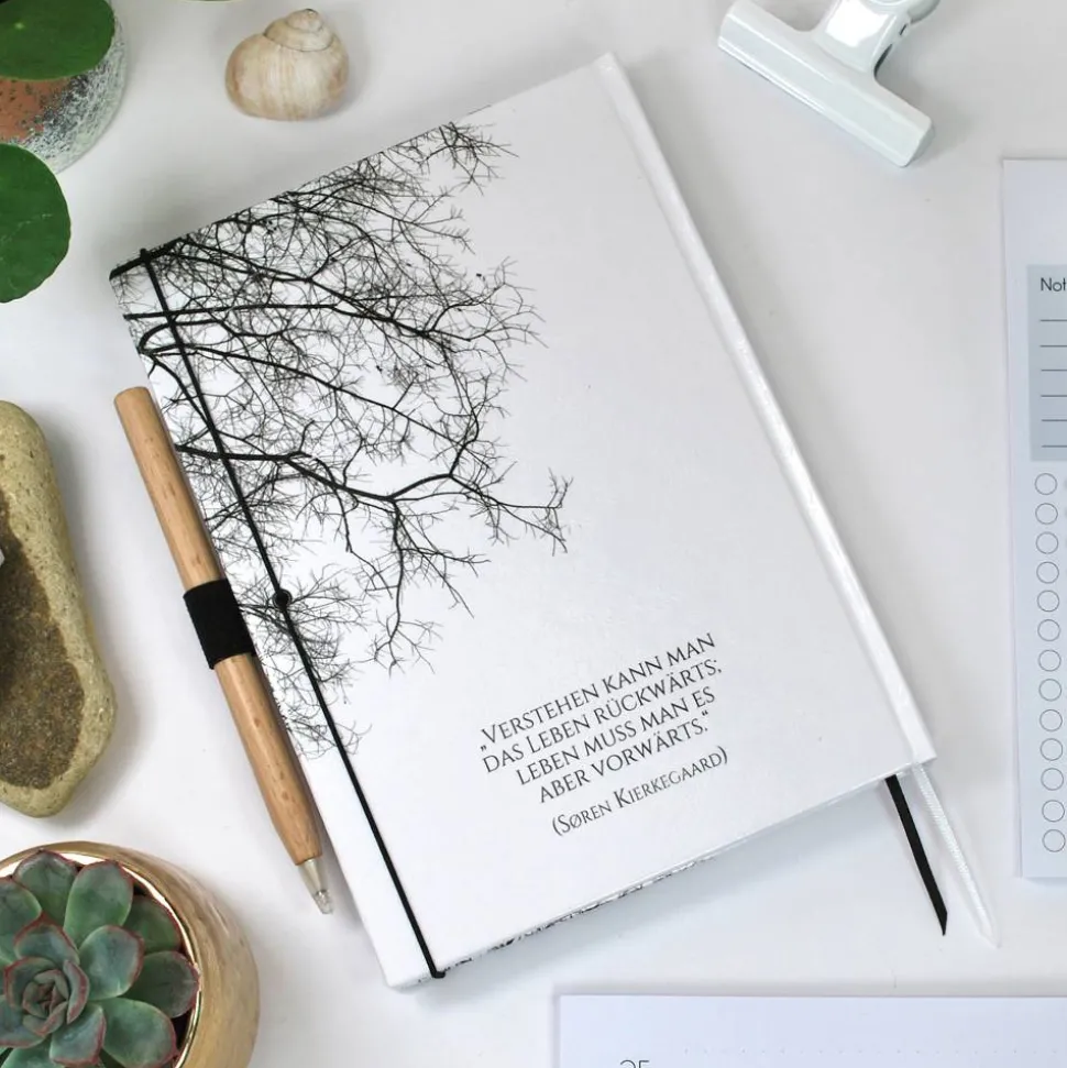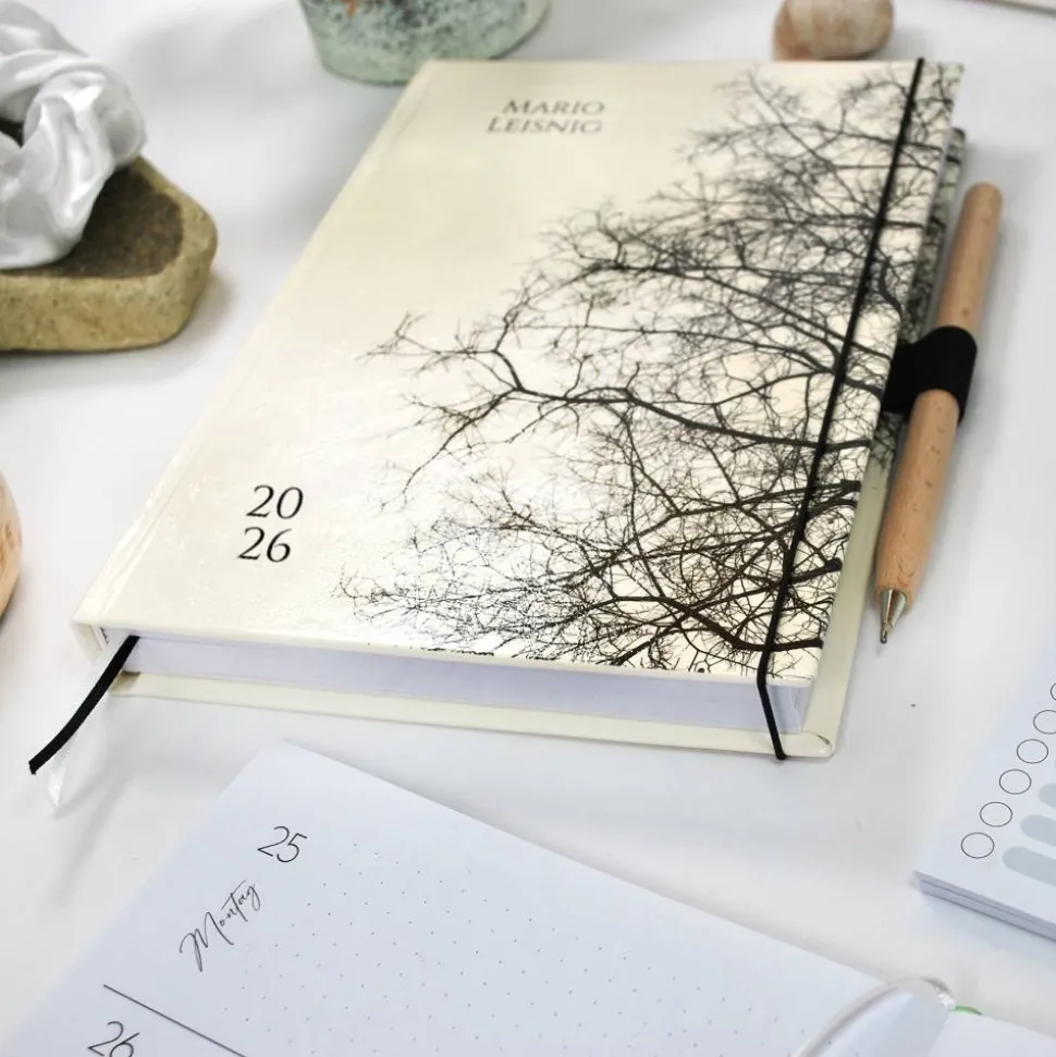 personalisierter, feinstrukturierter Hardcover-Buchkalender im handlichen A5-Format für das Kalenderjahr 2026 mit der Silhouette von Zweigen und Ästen eines Baumes – mit vielen praktischen Extras, wie integriertem Stifthalter, hölzernem Kugelschreiber, Tasche für Zettel, Lesebändern und Gummiband-Verschluss