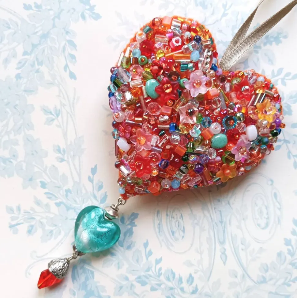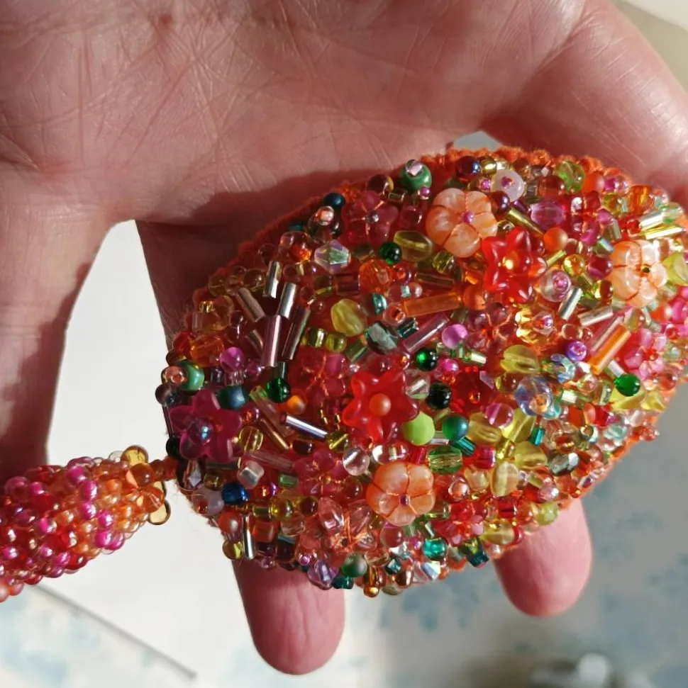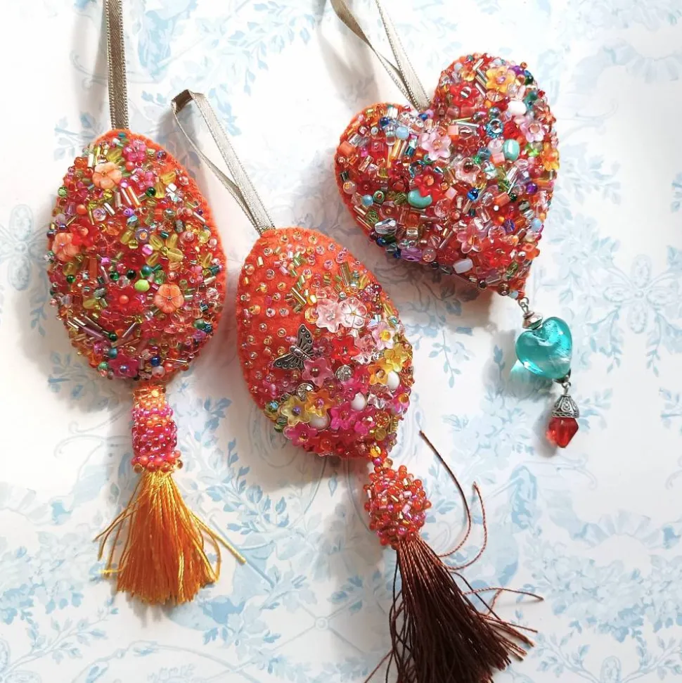 Das perlenbestickte Osterei und Herz ist innen gefüllt und fest aber doch angenehm weich gepolstert. Die Rückseite ist mit Perlen einer Farbe wie gepunktet gestaltet, die Anordnung als polka dots, also tanzende Punkte funkelt wertig im Licht. Das kommt besonders schön zur Geltung beim Einsatz vom Osterdei als Deko im Osterstrauß oder Taufgesteck. Auch toll als Tischdeko Aufleger zum Osterfest und anderen Anlässen.