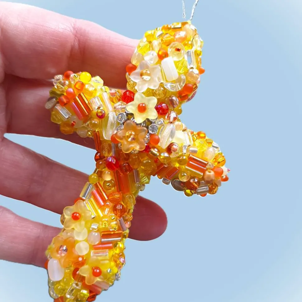 Entdecke die einzigartige Wohndeko für dein Zuhause: Ein handgemachtes Ornament als Osterei, Herz oder Kreuz – liebevoll in warmen Gelb- und Orangetönen mit edler Perlenstickerei verziert. Jedes Stück ist ein echtes Unikat, in Deutschland von Hand gefertigt und aufwändig bestickt – perfekt als festlicher Blickfang für Ostern, Konfirmation, Taufe oder Hochzeit.
