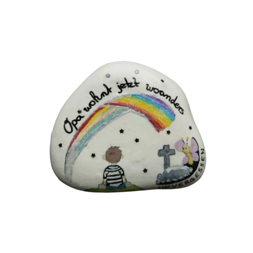 Dieser Trauerstein ist eine Spezialanfertigung und wird nur für Sie gemalt. Er trägt die Essenz Ihrer Erinnerungen, Liebe und Ihres Verlusts. Jeder Stein ist ein Symbol für die Einzigartigkeit eines Lebens, für Momente, die unvergessen bleiben. Sie sind Kunstwerke mit Herzblut und Hingabe, geschaffen, um die Schönheit des Lebens und die Liebe festzuhalten. Jeder Stein ist ein Unikat, das dazu bestimmt ist, zu berühren und zu verzaubern. ✨❤️