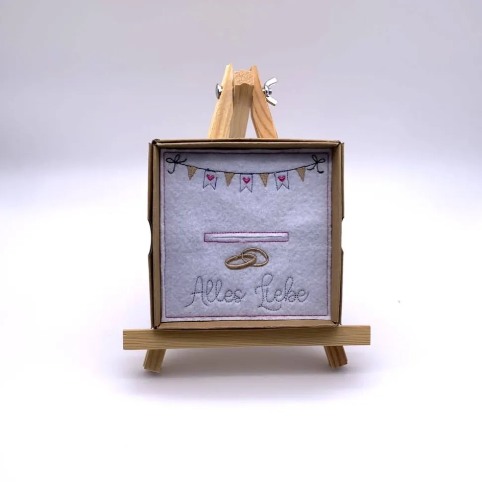 In dem Karton liegt eine liebevoll bestickte Karte aus weißem Filz. Bestickt ist diese Karte mit zwei Trauringen, einer Girlande und den Worten „Alles Liebe“. In den Schlitz können sie einen Geldschein oder einen Gutschein stecken.