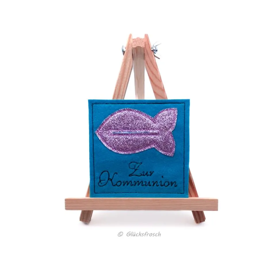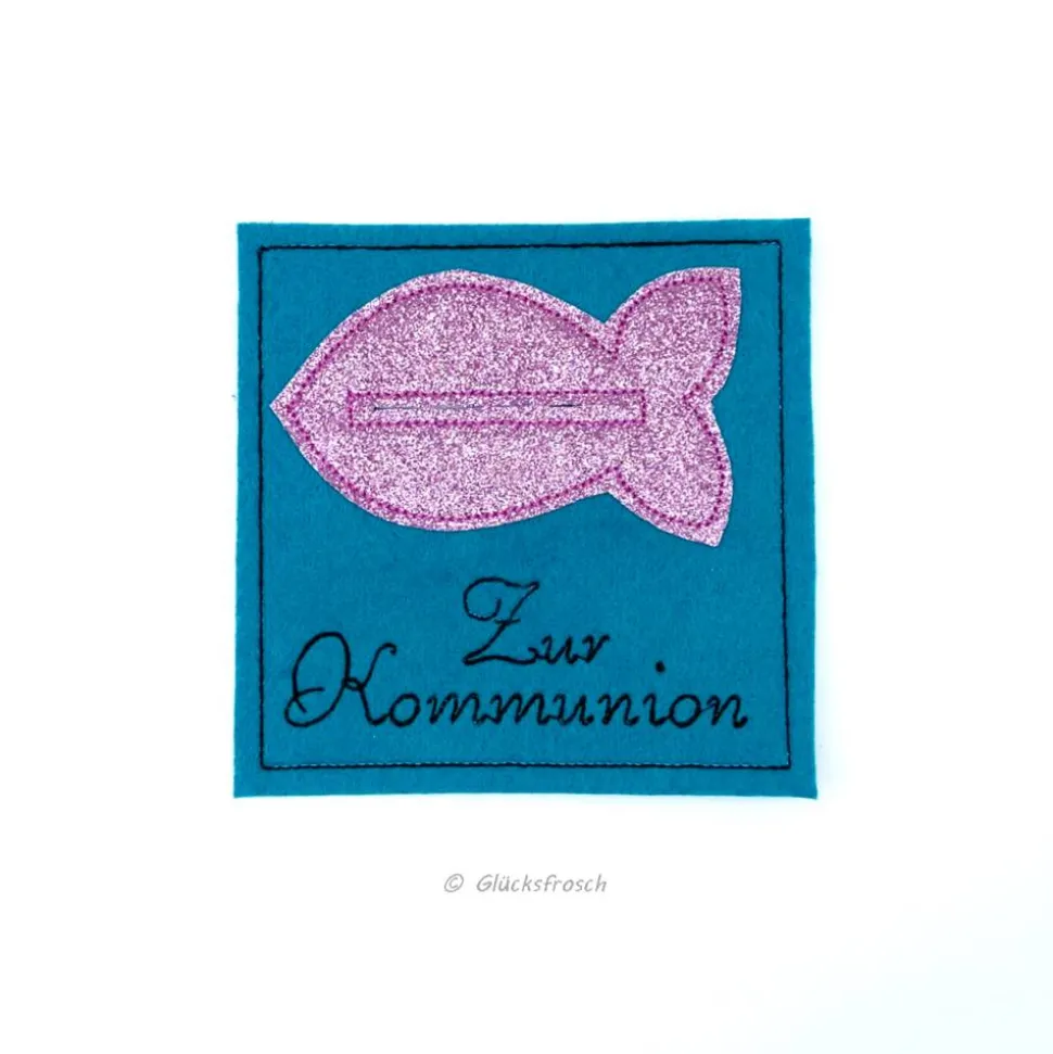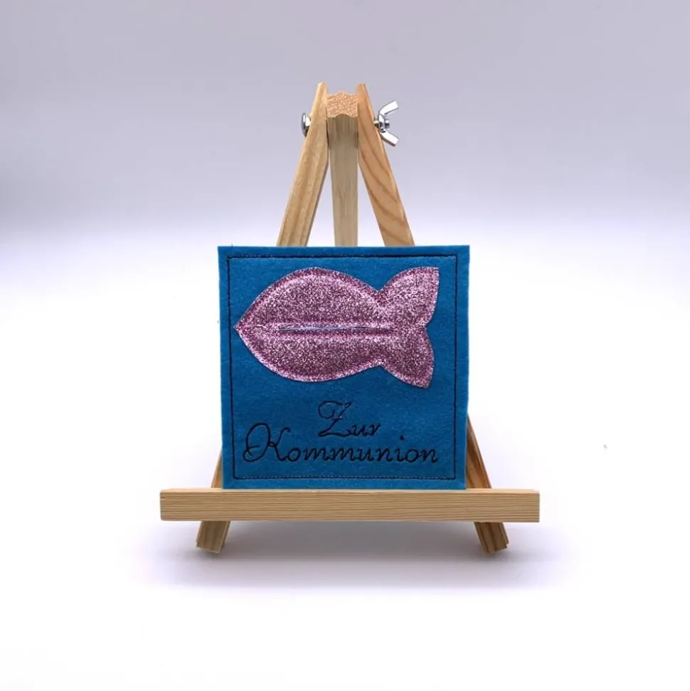 Der Filz ist türkis und aus 100 % Polyester, innen hat der Wunscherfüller eine Schicht dickes Papier. Auf der Filzkarte ist ein rosa, glitzernder Fisch appliziert aus Kunststoff.
