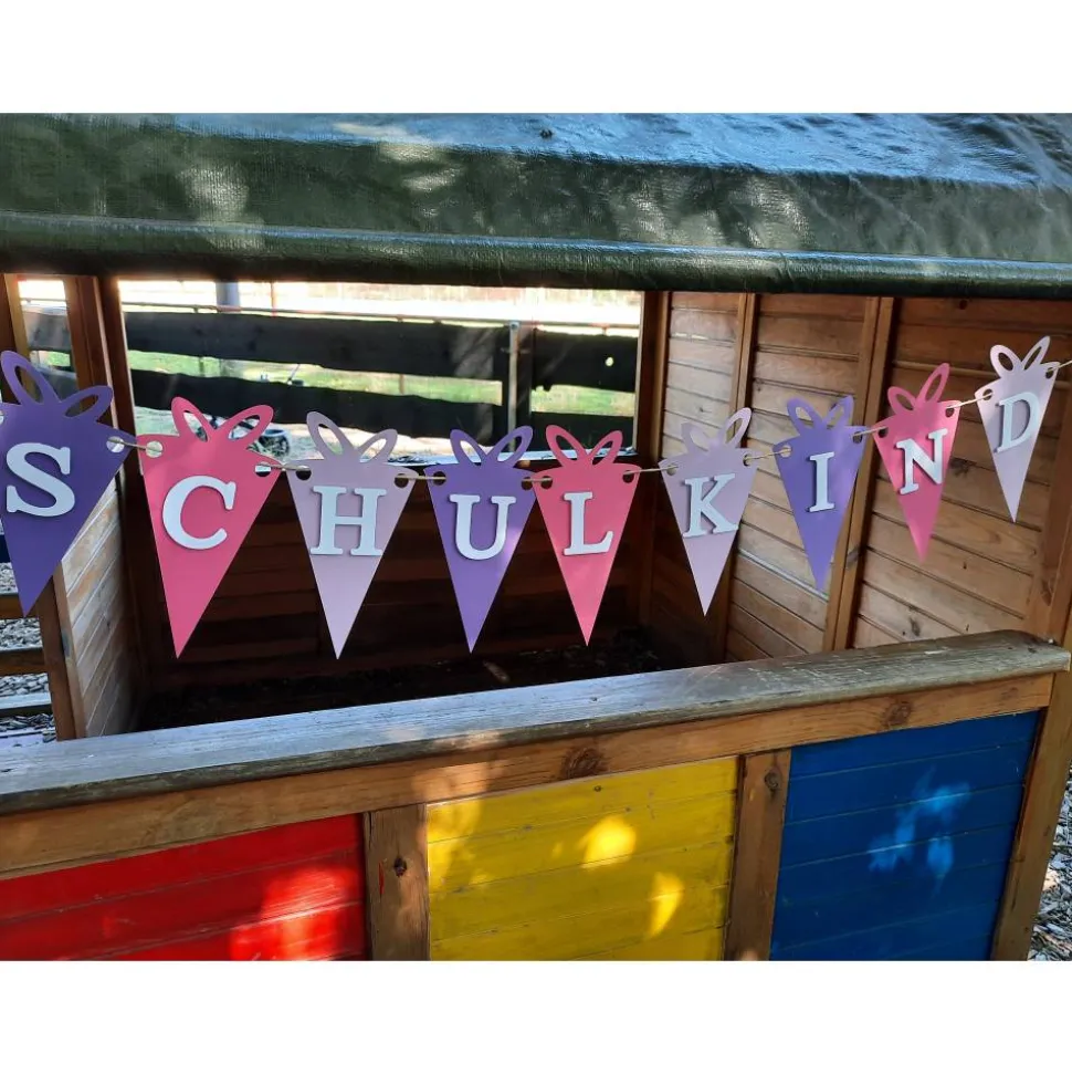 Mit unserer super niedlichen Girlande mit kleinen Schultüten und der Aufschrift „Schulkind“ kommt die richtige Deko für diesen wichtigen Tag.
