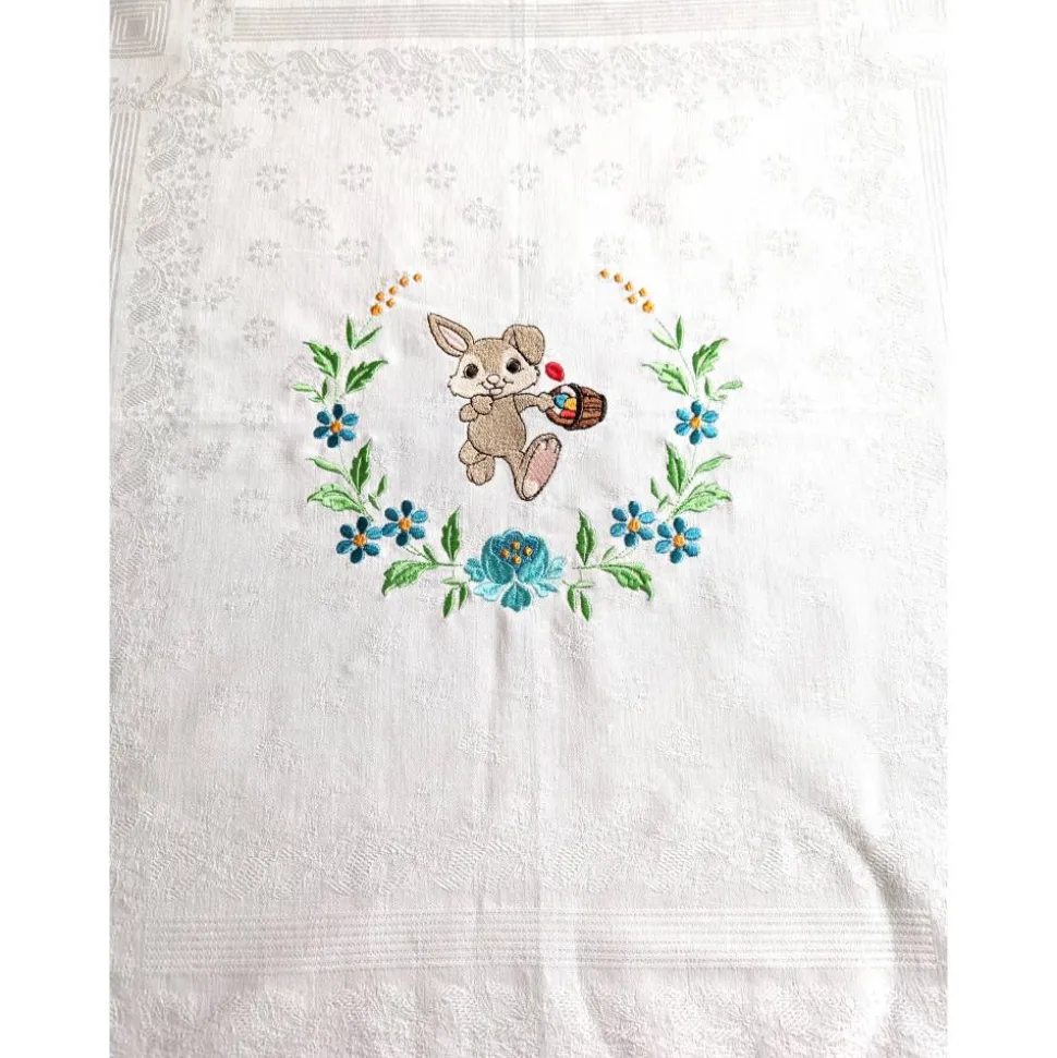 Eine bisschen Nostalgie zu Ostern? Eine kleine bestickte Decke, die ich aus einer antiken Serviette mit aufwändiger Randverarbeitung und Damastmuster gefertigt habe. Die Serviette ist quadratisch und aufgrund ihrer Größe auch wunderbar als Mitteldecke oder Decke für einen kleinen Tisch geeignet. Sie ist mit einem superniedlichen kleinen Osterhasen in einem aufwändigen Blütenkranz aus blauen Blüten bestickt. Eine tolle Osterdeko im Cottagestil für Deinen Tisch. Aber auch wunderbar als kleine Decke für ein Picknick im Frühling geeignet, das sie bis 60 °C gewaschen werden kann.