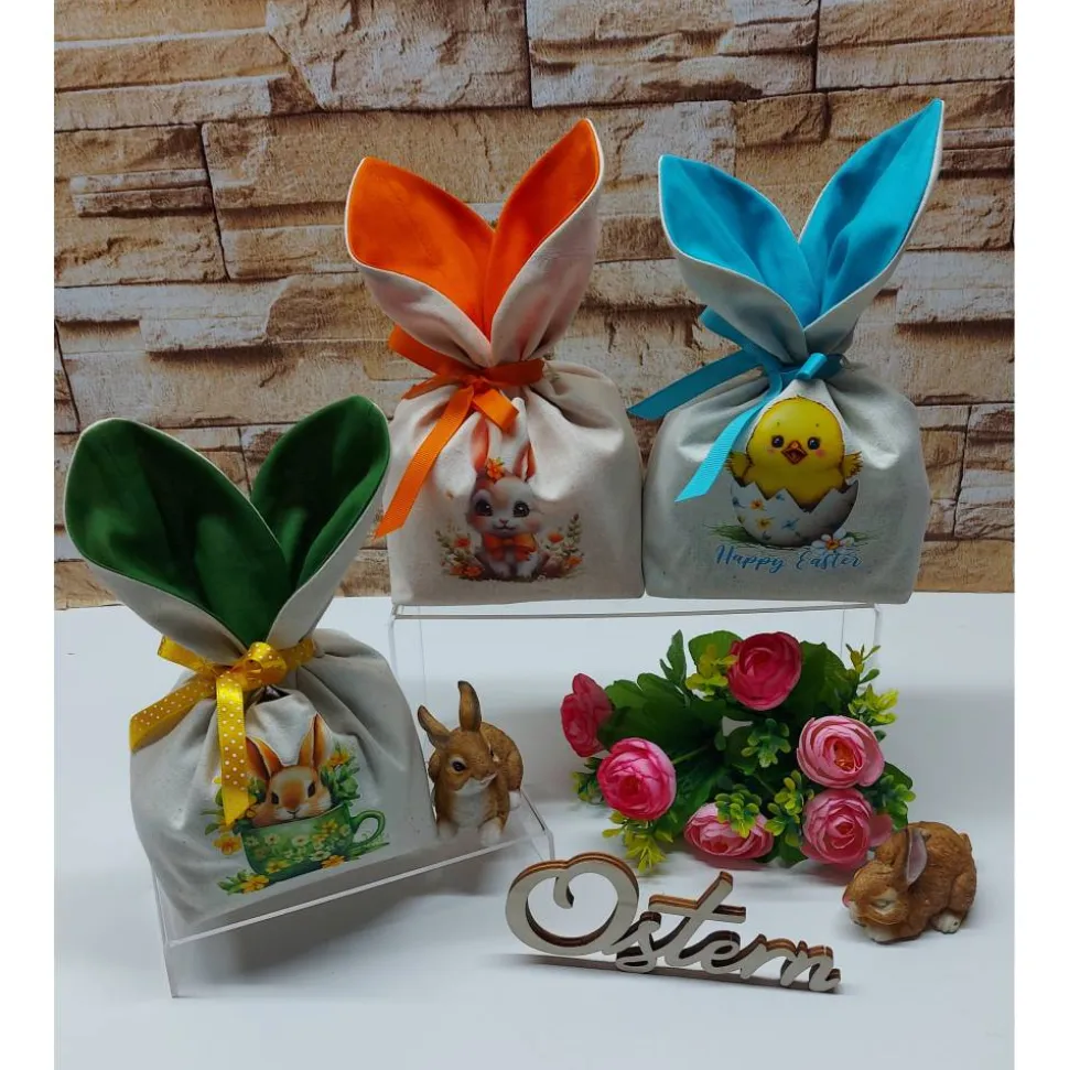 Die Ostersäckchen bestehen aus reinen Baumwollstoffen und sind auf der Vorderseite mit einem hübschen Osterbügelbild versehen.