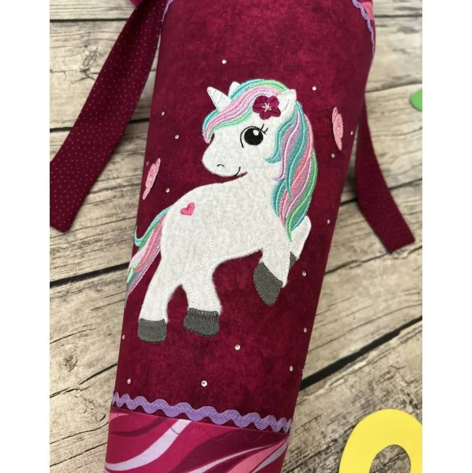 Hier habe ich eine ganz besondere für euch. Genäht aus zauberhaftem Baumwoll-Stoffen in Beere/Rosa Tönen und bestickt mit einem wunderschönen Stickmotiv “ Einhorn“ von Marilena Stoffzaubereien. Und zusätzlich verziert mit kleinen Glitzersteinchen.