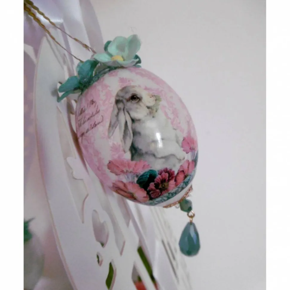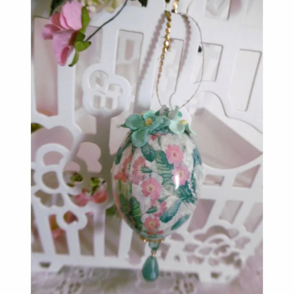 Das Ei ist mit einer exclusiven Schrumpffolie gestaltet. Es ist mit farblich passenden Blüten und als Abschluß mit einem Schuckstein, der am unteren Teil des Eis hängt, verziert.