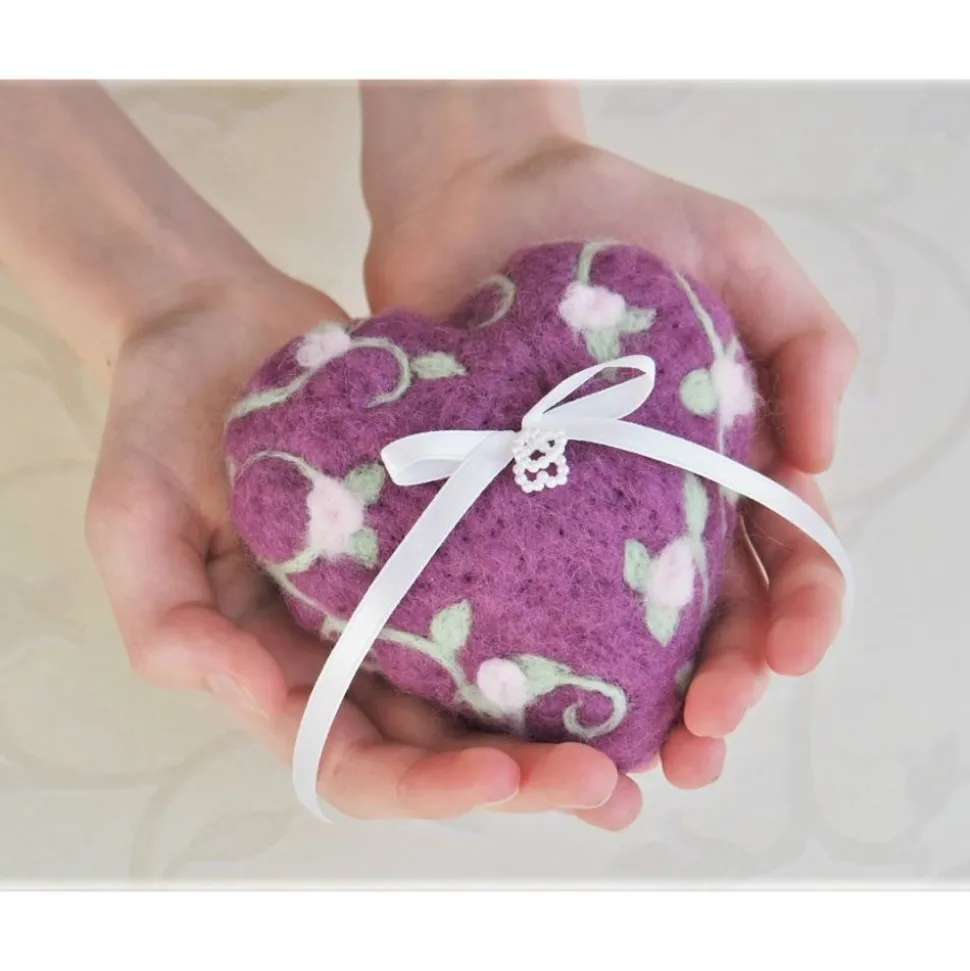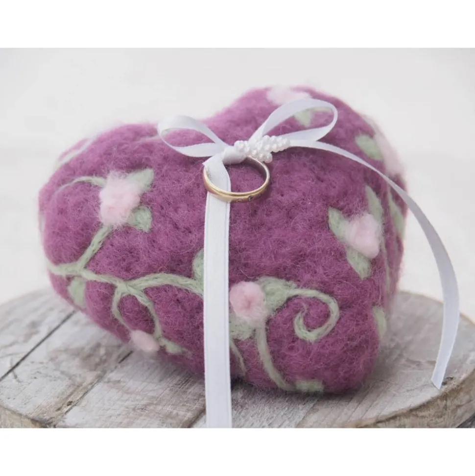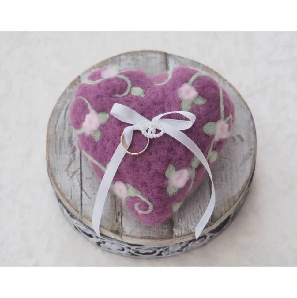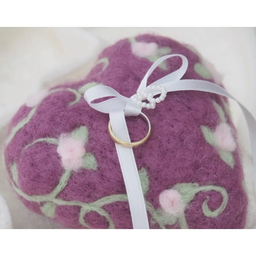 Ein Ringkissen in Herzform aus wunderbar feinster Wolle für Deine Hochzeit in reiner Handarbeit angefertigt . Durch die Anwendung in Nadelfilztechnik bleibt der weiche und feine Charakter der Wolle ganz erhalten. Wunderbar angenehm auf der Haut. Das Herz enthält keinen Styroporkern, sondern ist aus 100 % Wolle angefertigt. Das Herz hat eine angenehme Größe und kann in einer Hand gut getragen werden. Die Ringe können an den Bändern festgemacht werden.