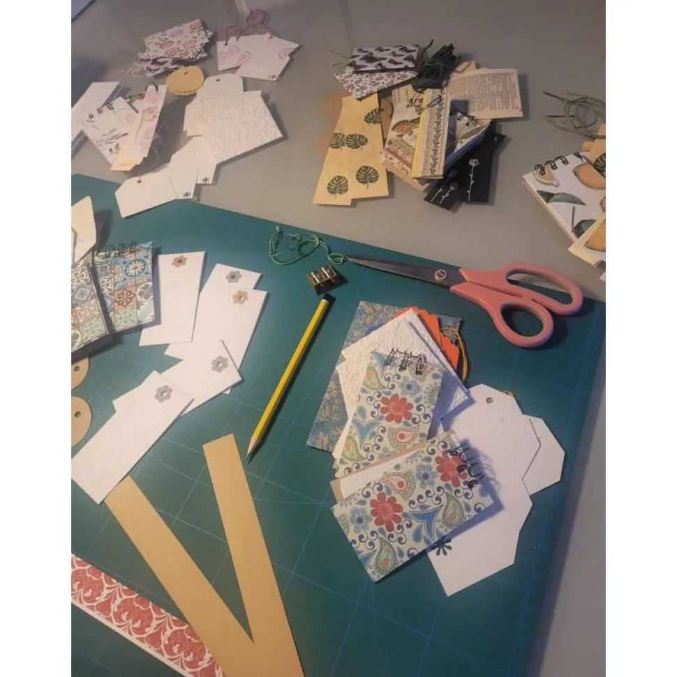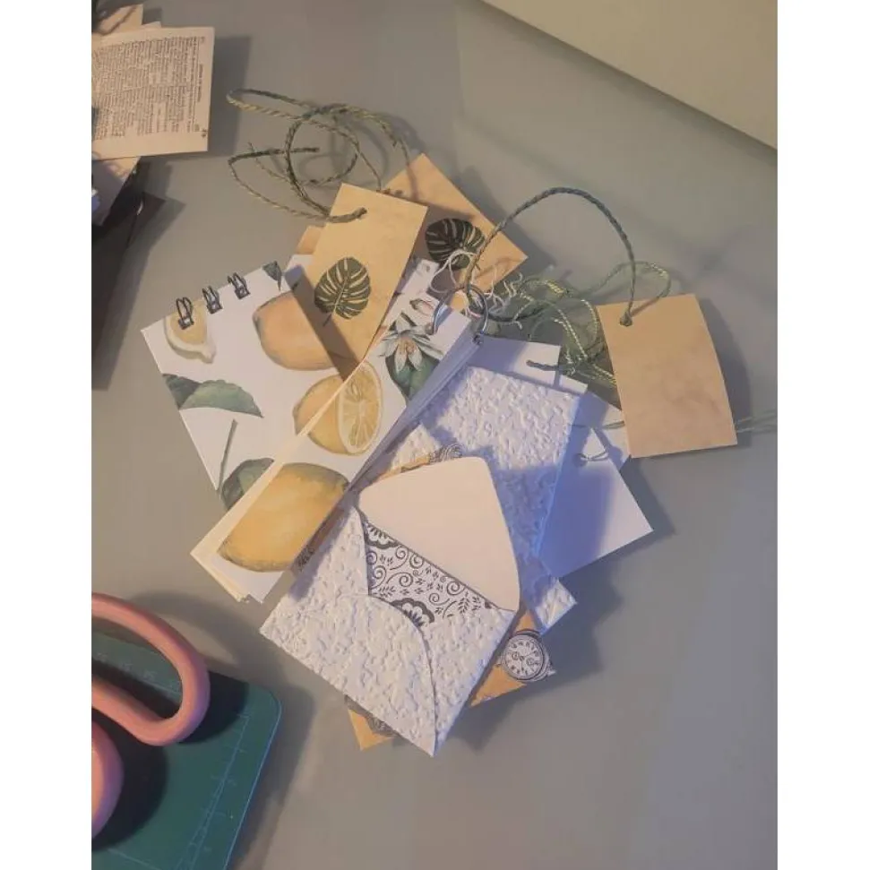 gefüllt mit je 2 Miniblöcken und einem Mini – Vokabelblock mit Ring, Tags ( immer mit einem Bändchen zum Anhängen versehen ), Mini – Umschlägen, Tütchen … Stückchen Geschenkband …