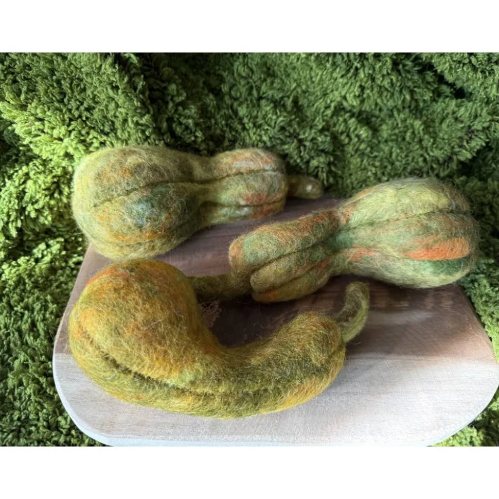 Diese liebevoll gefertigten Flaschenkürbisse aus Wollfilz bringen herbstliche Farbenpracht in dein Zuhause. Mit einer Länge von ca. 17–20 cm sind sie vielseitig einsetzbar – ob als Tischdeko, Fensterbank-Schmuck oder als stimmungsvolle Ergänzung zum Erntedankfest.