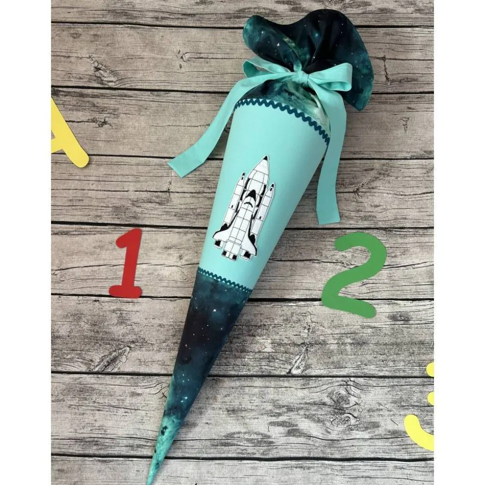 Hier habe ich eine ganz, ganz besondere Schultüte für euch. Genäht aus schönen Baumwollstoffen in Petrol Galaxie mit Uni mint.