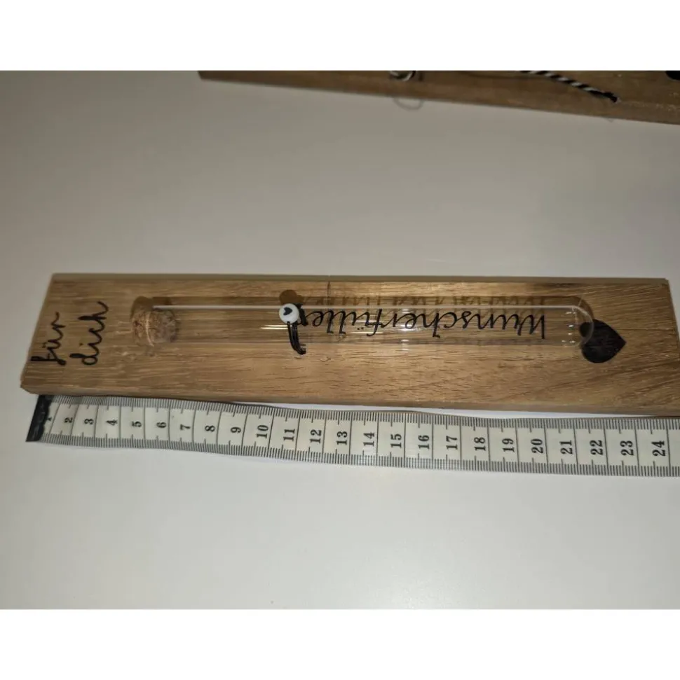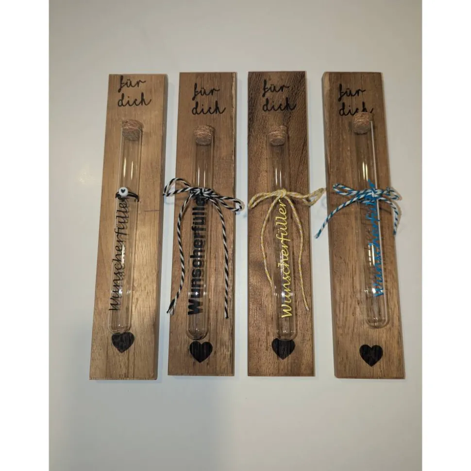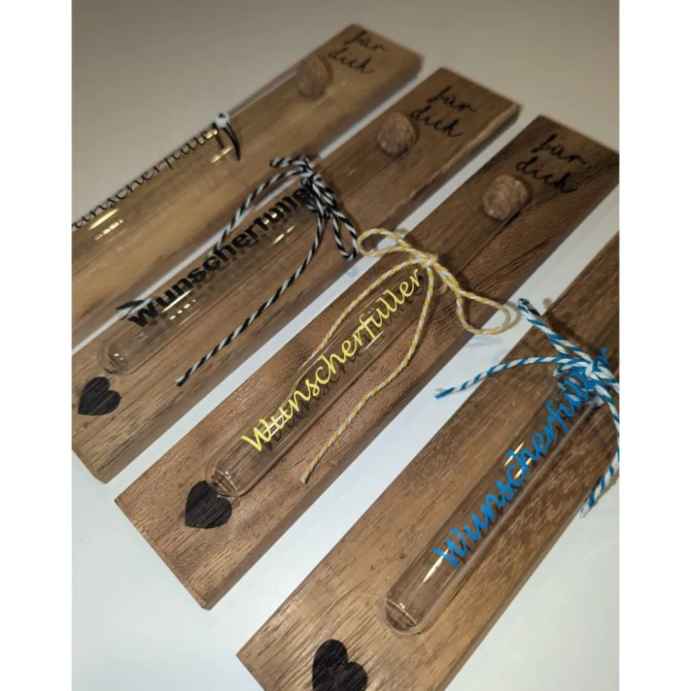 Die schöne Verpackung besteht aus einem schönen Stück Holz, gelastertem Schriftzug und Herz und einem Reagenzglas.