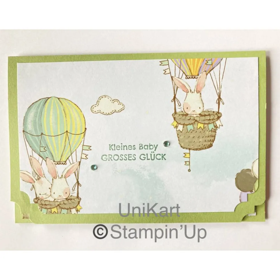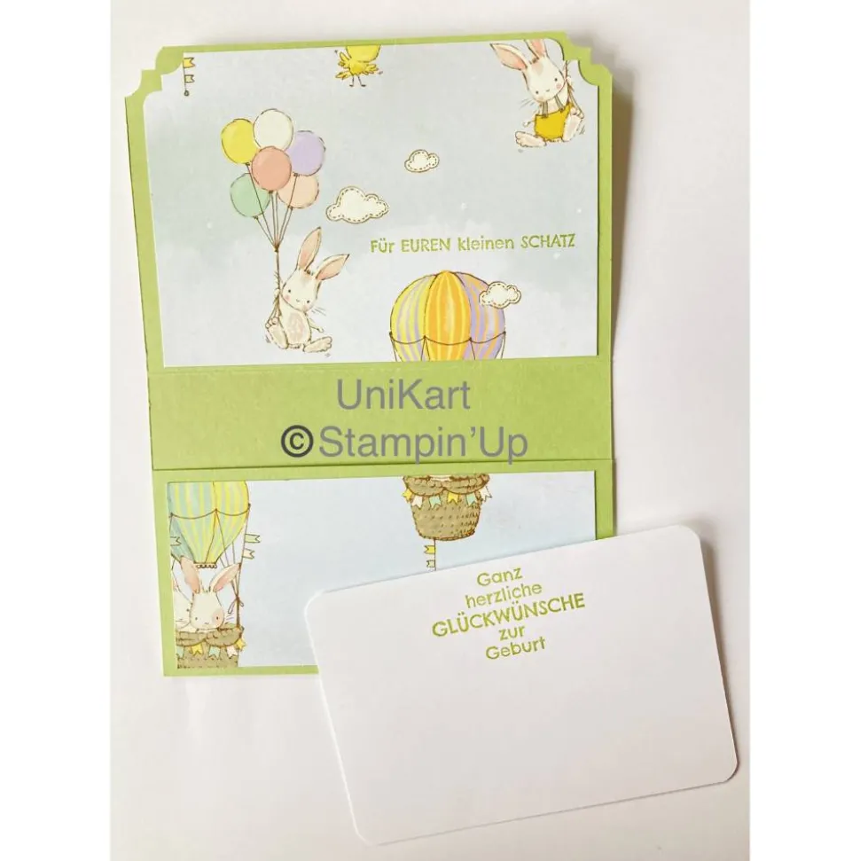 Im Inlett ist ein Stempelspruch „Ganz herzliche Glückwünsche zur Geburt“ und
