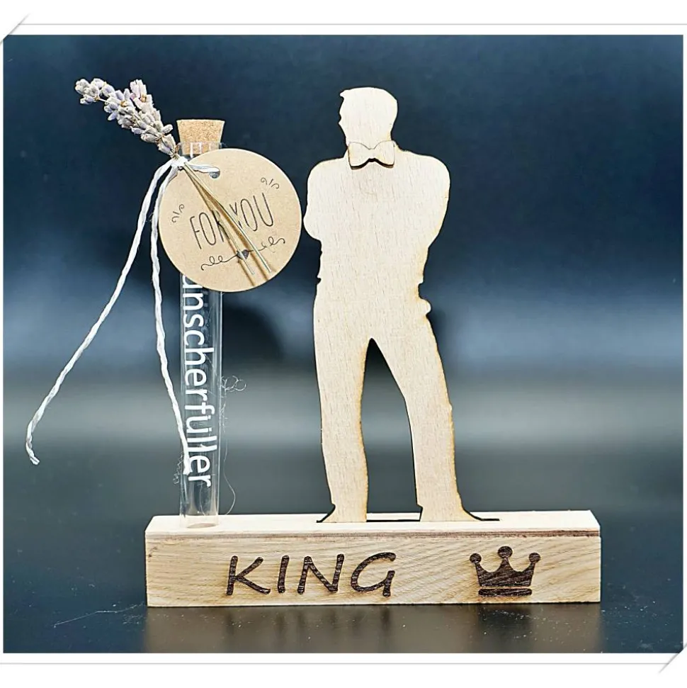 Unsere Wunscherfüller sind mehr als nur dekorative Elemente – sie sind ein Symbol für Träume, Wünsche und die Schönheit von handgearbeitetem Eichenholz. Jeder Wunscherfüller verfügt über ein edles Reagenzglas, das perfekt für Ihre Geldgeschenke oder liebevollen Botschaften geeignet ist. Verleihen Sie Ihrem Geschenk eine persönliche Note, indem Sie zwischen einer schlichten Ausführung oder einer individuellen Gravur wählen. Wie wäre es zum Beispiel mit den liebevollen Worten „Für dich“, „King“