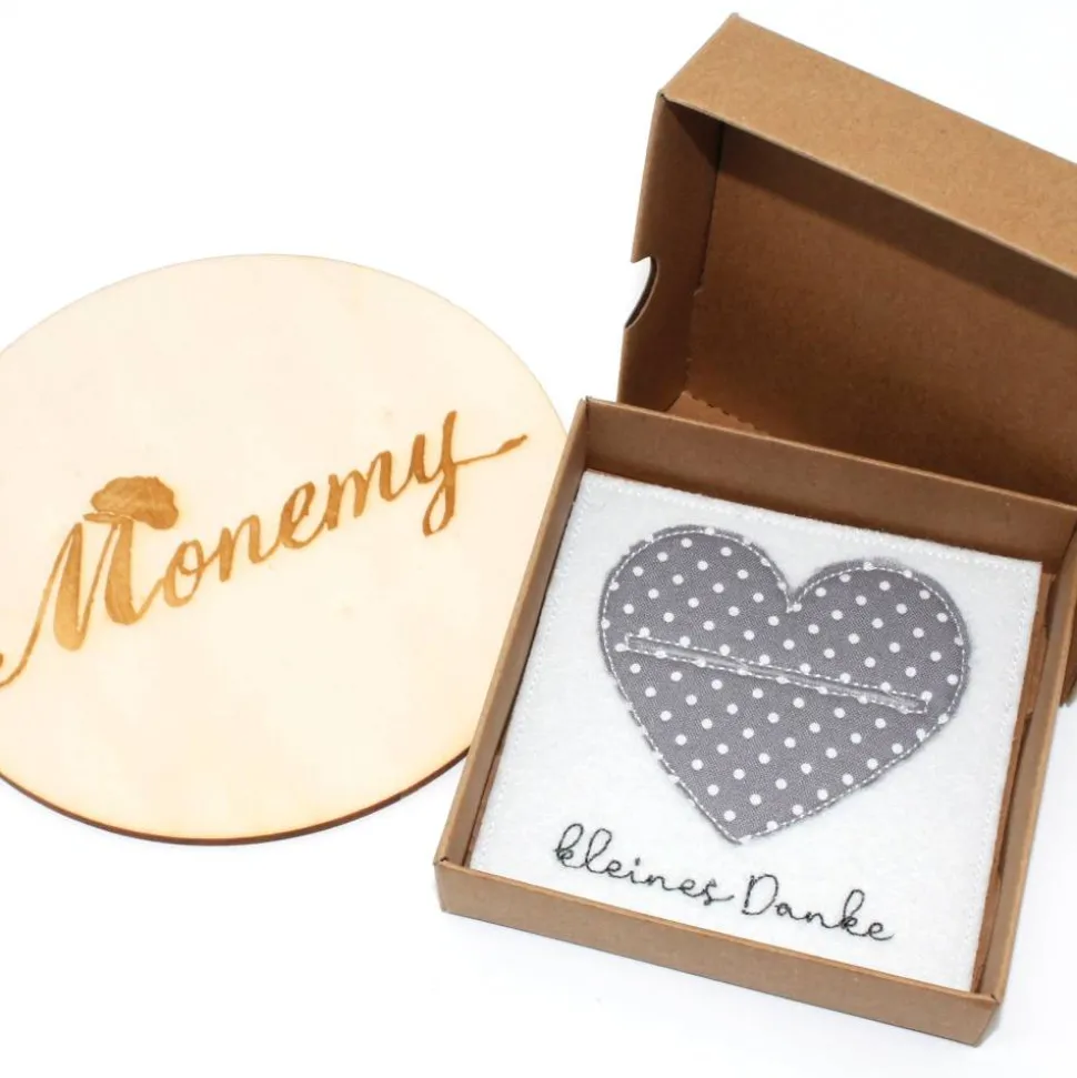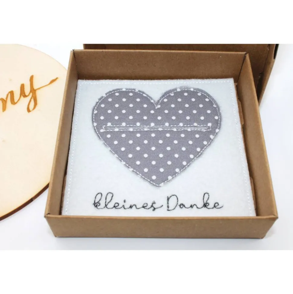 Unter dem Herz ist „kleines Danke“ fein eingestickt – schlicht, ehrlich und persönlich. Geliefert wird alles in einer stabilen Geschenkbox – bereit zum Verschenken!