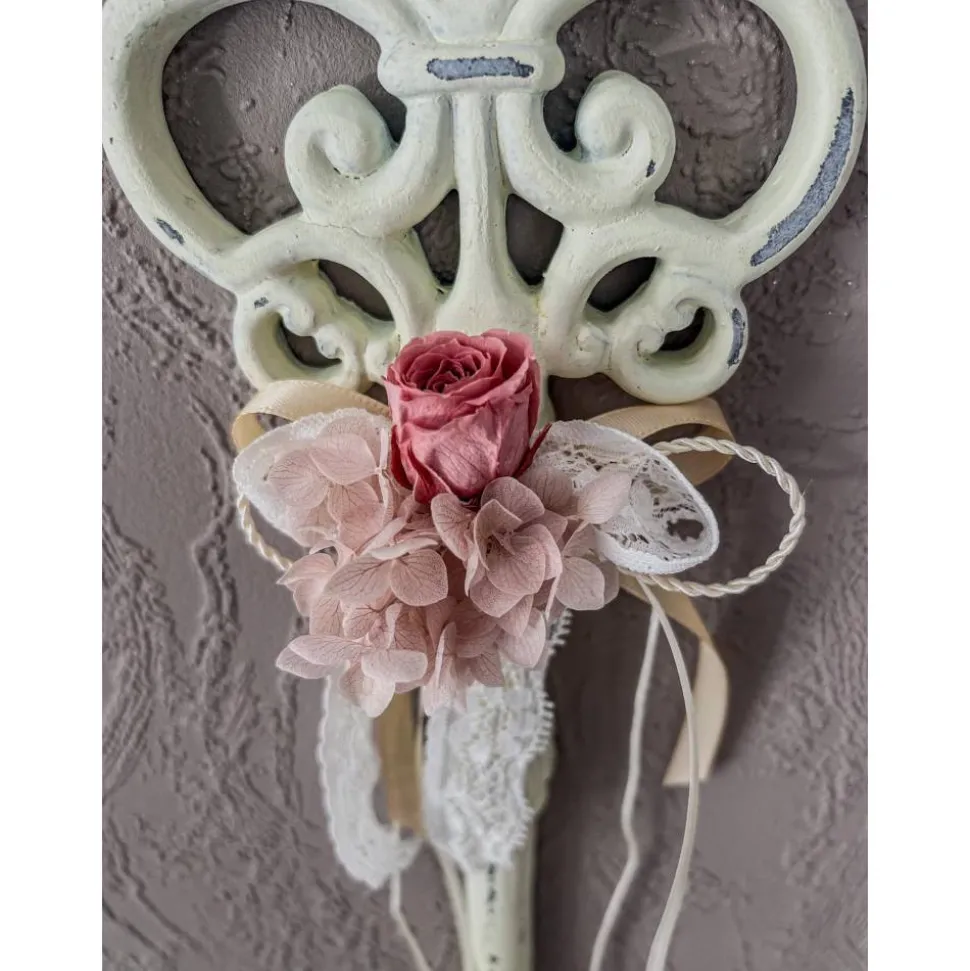 Mit einer stabilisierten Rose, Hortensie, Schlaufen und Spitzenband.