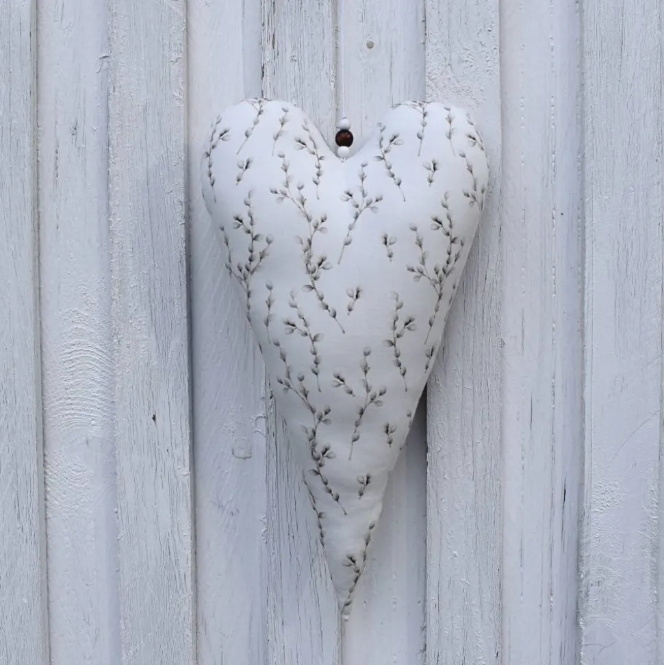 ein beigefarbener grober Baumwollstoff und ein altweißer Webstoff mit Weidenkätzchenzweigen – beide 100 % Baumwolle,