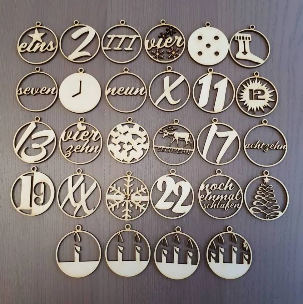 Geliefert werden 28 Anhänger – die Zahlen von 1 bis 24 sowie vier Anhänger für die Adventssonntage. So kannst du diese individuell dazumischen, wie du es möchtest und die Zahlen können für die Folgejahre wieder verwendet werden.