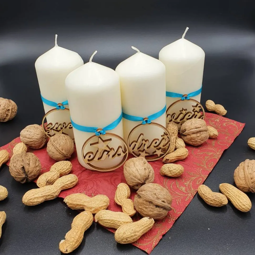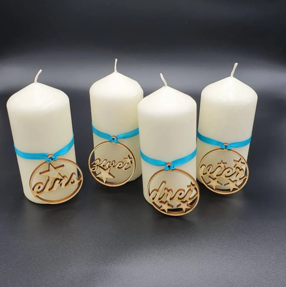 Geliefert werden 4 Anhänger – für jeden Adventssonntag einer. Die Anhänger kannst du wunderbar für die nächsten Jahnre weiterverwenden. Mit unterschiedlich farbigen Bändern und nterschiedlichen Kerzen lässt sich ein jeweils auf deinen Einrichtungsstil angepasstes Design erreichen.