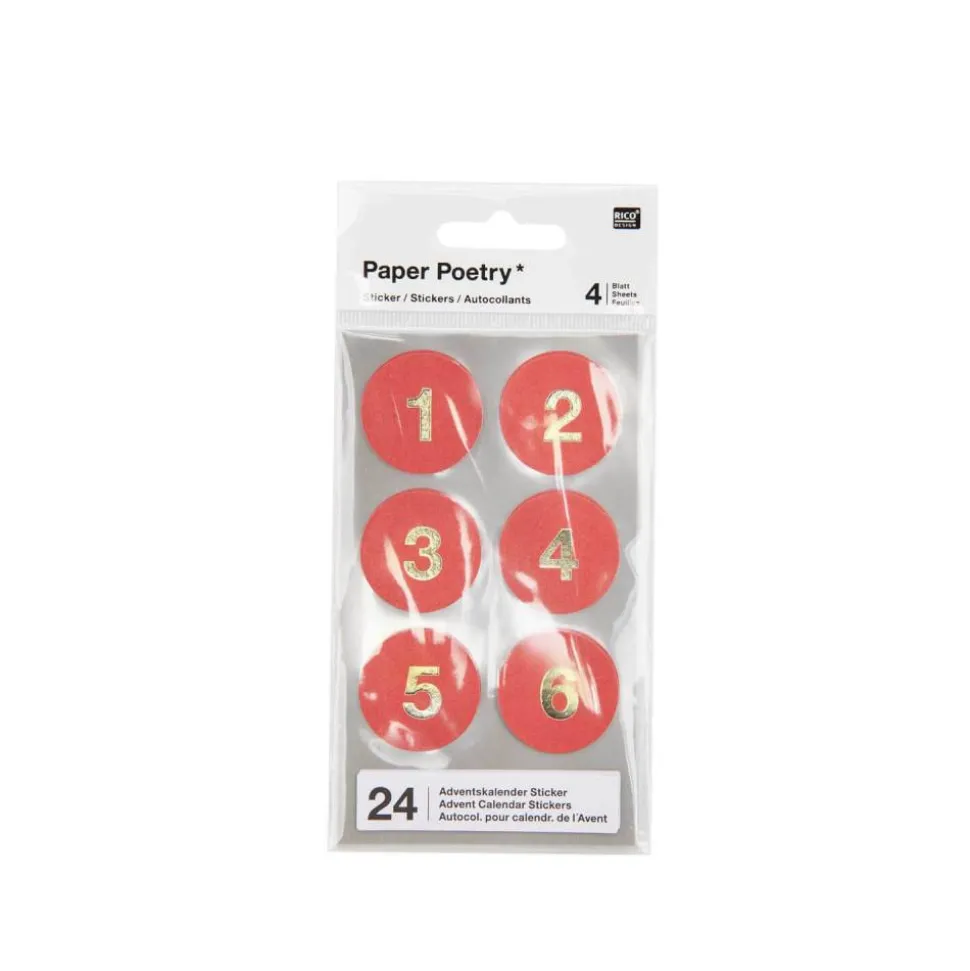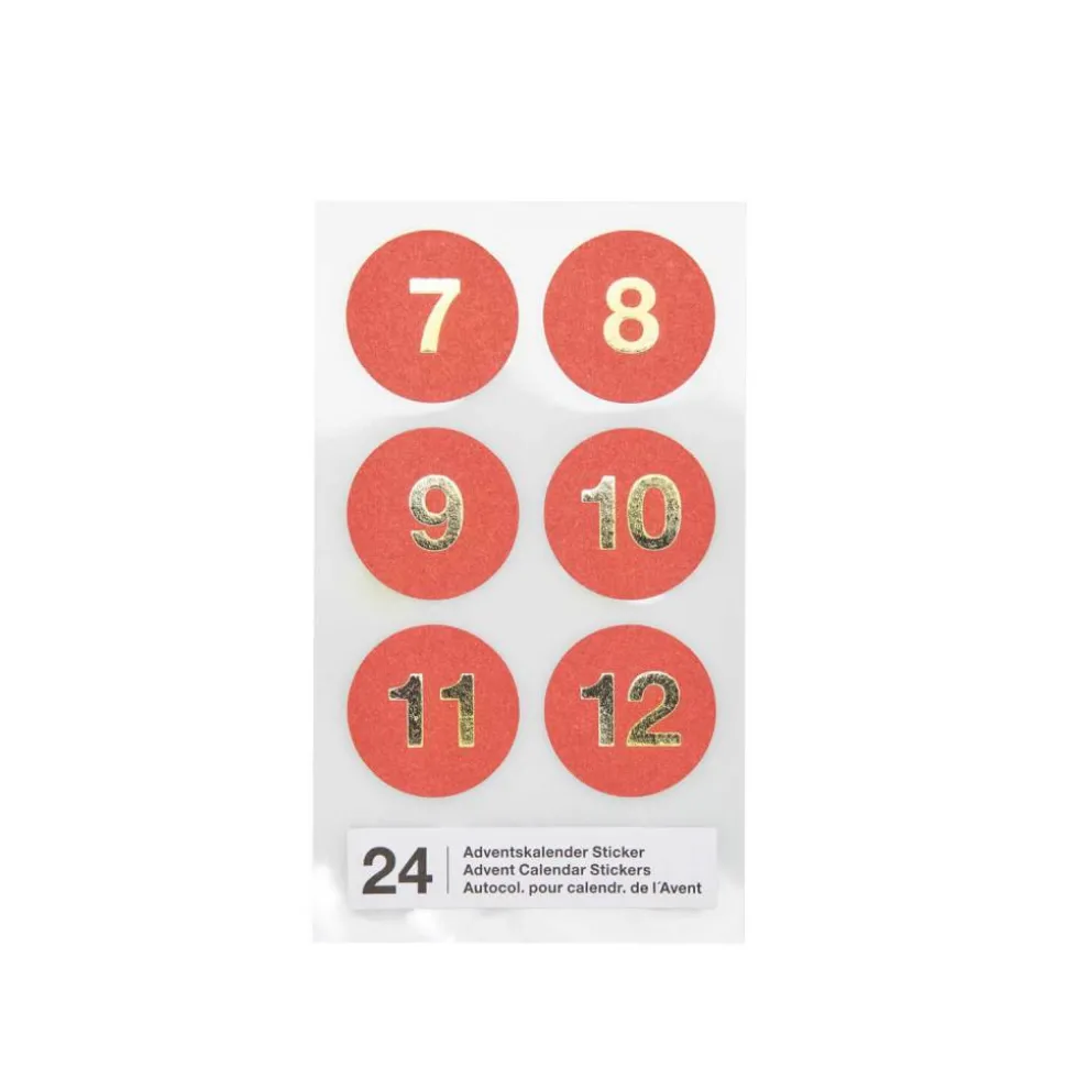 Die roten Zahlensticker sind ca. 28 mm groß. Die Sticker lassen sich direkt auf Papier oder Pappe kleben. Die glänzenden Adventskalenderzahlen sind mit Hotfoil aufgedruckt.