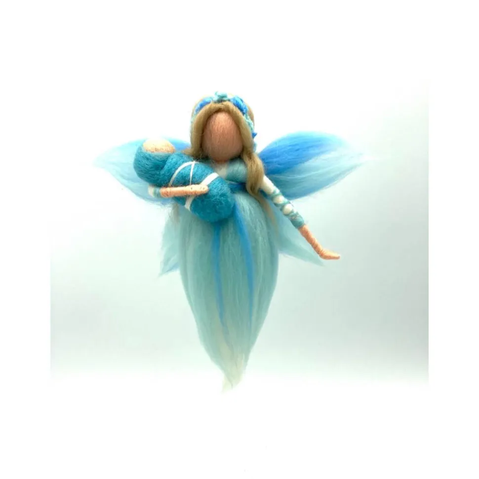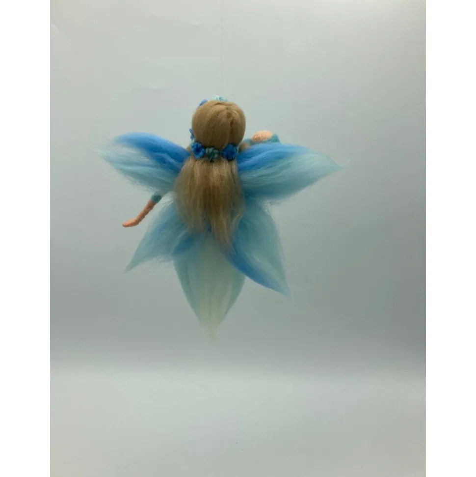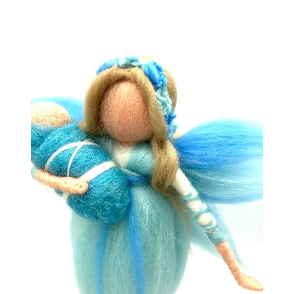Eine zarte leichte Wiegenfee in sanften Blautönen. Die Wiegenfee ist ca 20 cm groß und ein wunderbares Geschenk zur Ankunft eines neuen Erdenbürgers. Die Fee wurde mit der Nadel in Handarbeit gefilzt. Auf Wunsch können auch andere Farbtöne verwendet werden und/oder die Haarfarbe geändert werden – sprechen Sie mich dafür gerne an
