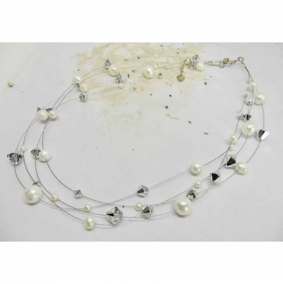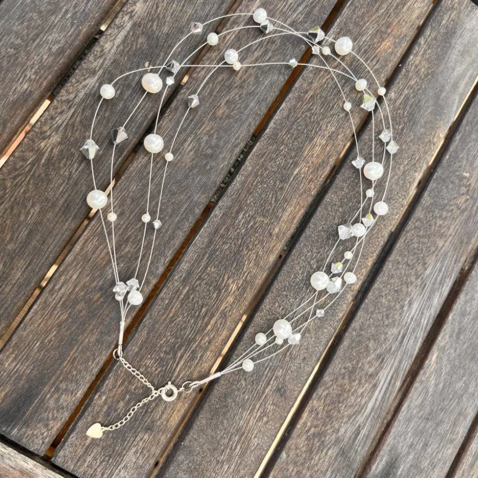 Verleihe deinem Brautlook Eleganz und Glanz! Diese zarte Brautkette aus vier Reihen dünnem Juwelierdraht kombiniert echte schwebende weiße Perlen in vier verschiedenen Größen mit funkelnden Kristallen. Die silbern glitzernden Kristalle und die authentischen Perlen sorgen für ein einzigartiges und luxuriöses Schmuckstück, das dich an deinem besonderen Tag erstrahlen lässt.