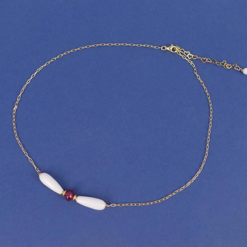 Steine: Rubin 3,5 x 6 mm, weißer Chalcedon 16 x 6 mm, Kascholong Opal 4 mm am Herz-Verlängerungskettchen.