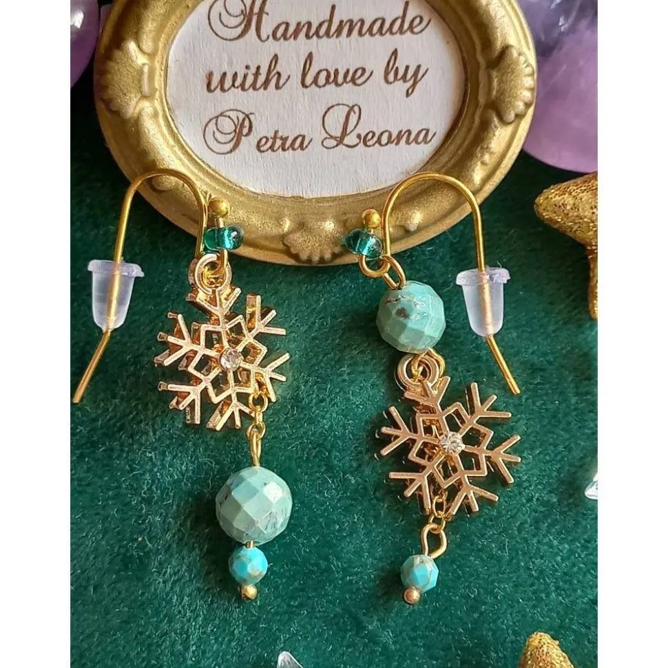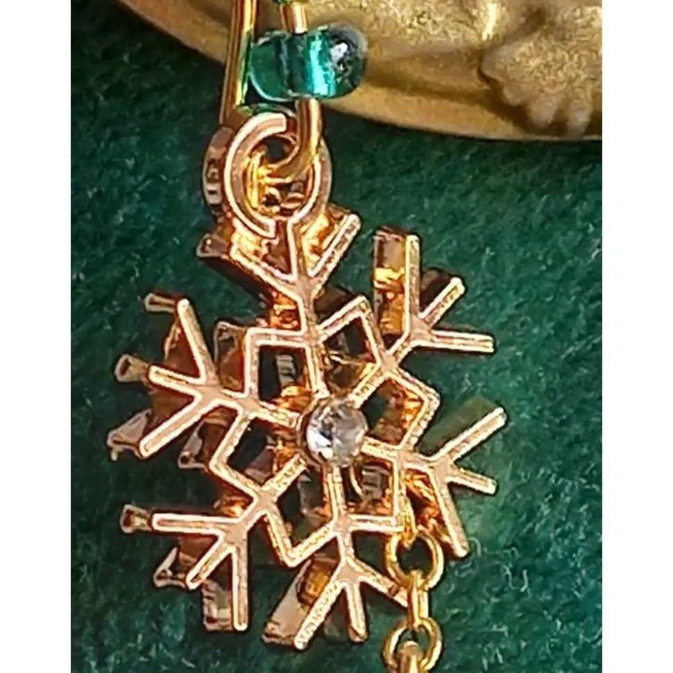 2 gold-farbenen Schneeflocken-Anhängern (ca. 16 x 13 x 3 mm) aus Aluminium mit jeweils einem kleinen klaren Strass-Stein in der Mitte,