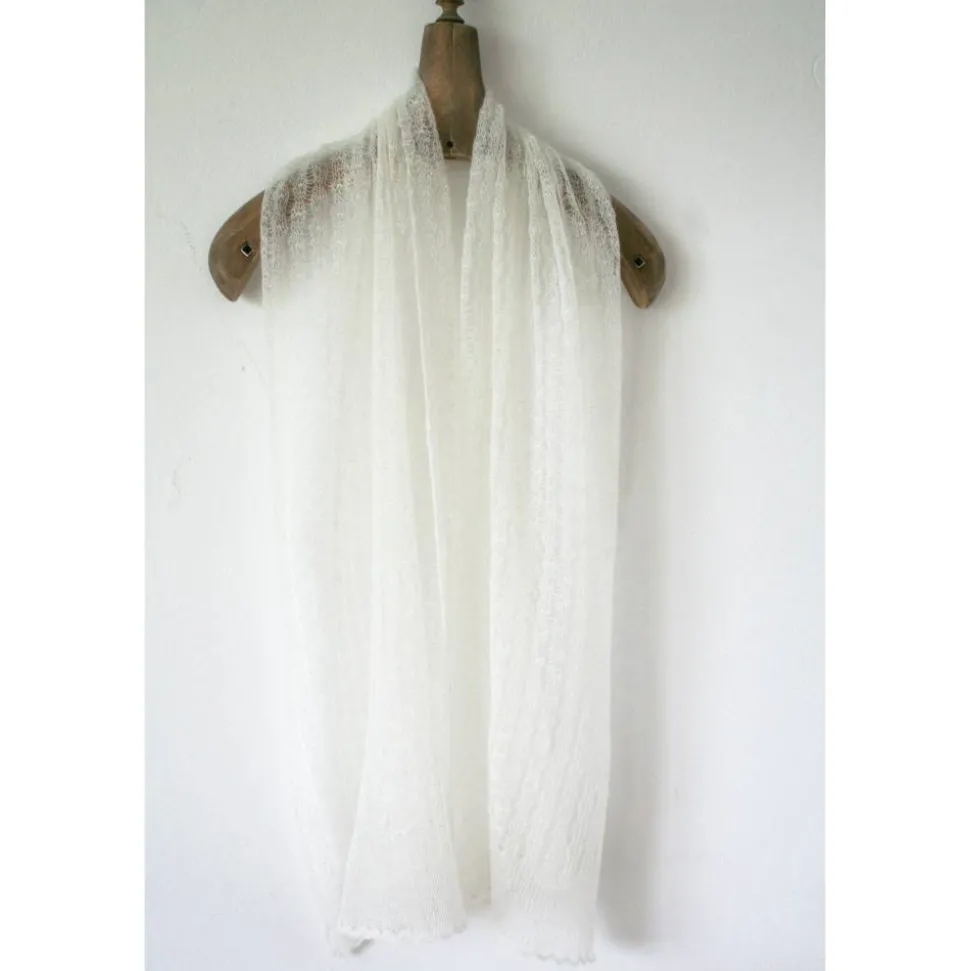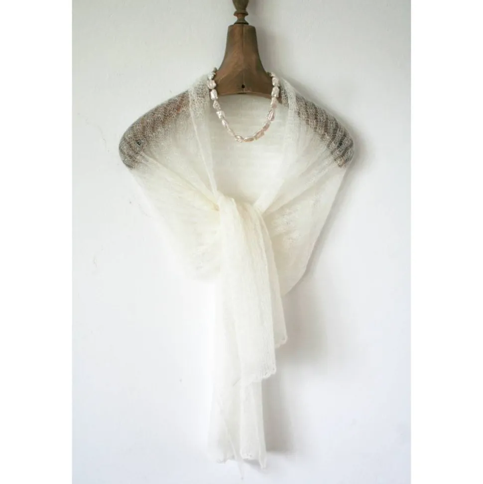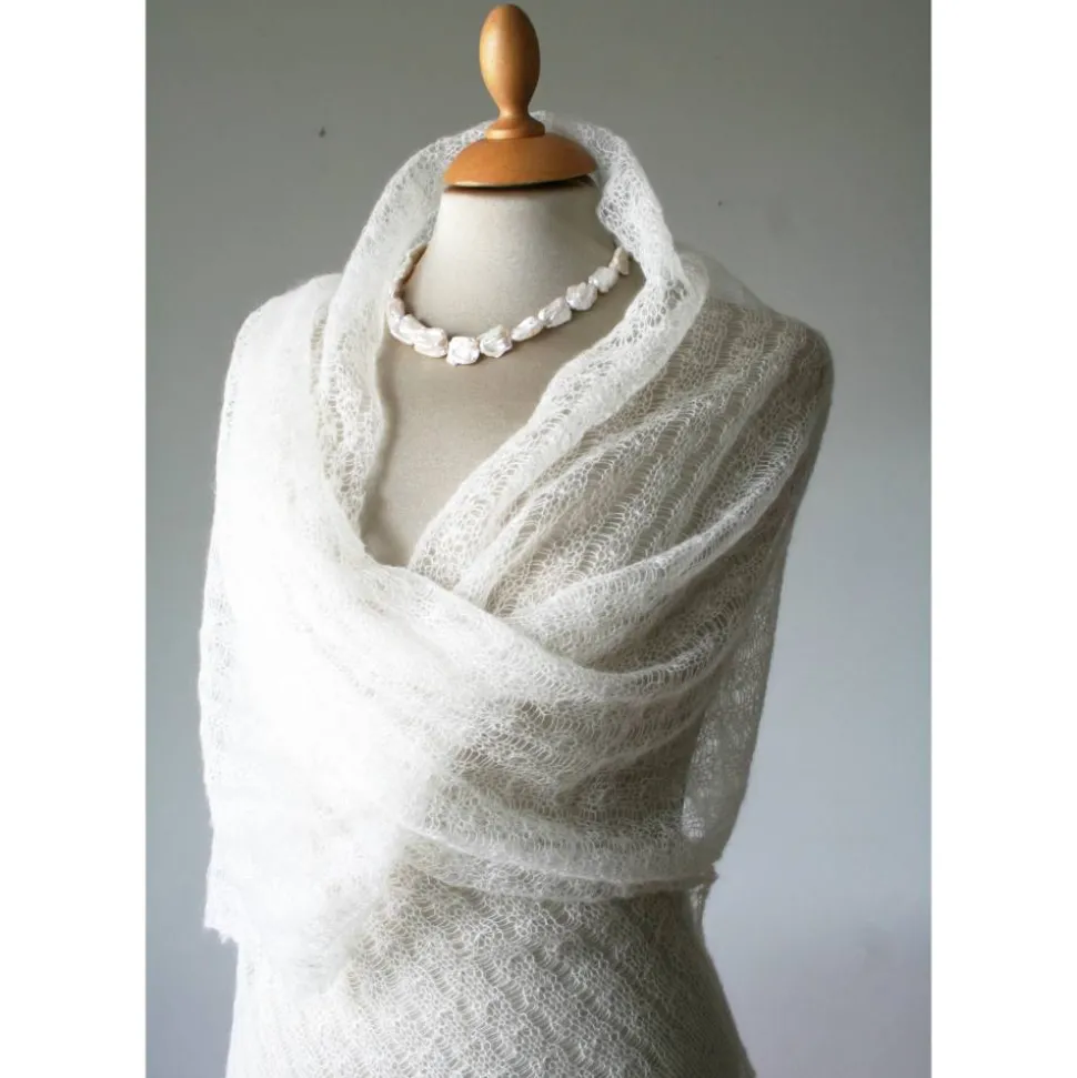 Das zarte Tuch ist aus einem dünnen italienischen Mohair-Garn gestrickt. Das dezente Muster ist zeitlos und elegant. An beiden Endkanten sind bogenförmige Bordüren gearbeitet.