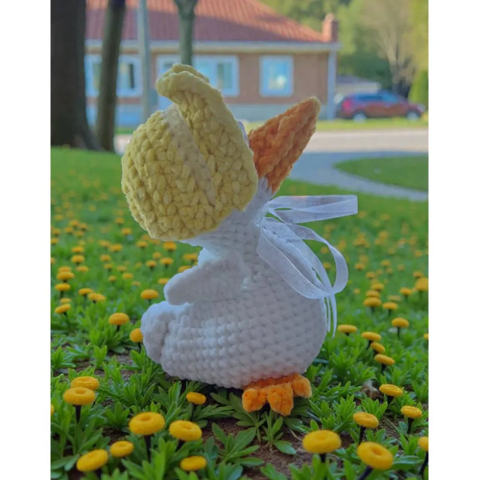 Wandelbar: Die gelbe Haube ist abnehmbar, sodass die Ente ihren Look ganz einfach verändern kann. Das edle Organzaband rundet das Design perfekt ab.