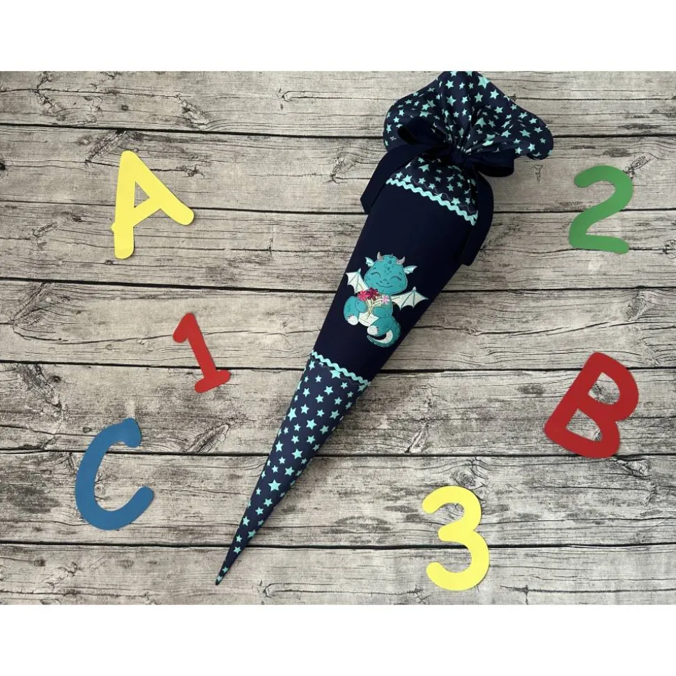 Die Schultüte ist 70cm groß, Plus der Stoff zum verschließen und genäht aus 98% Baumwolle 2%Elastan.