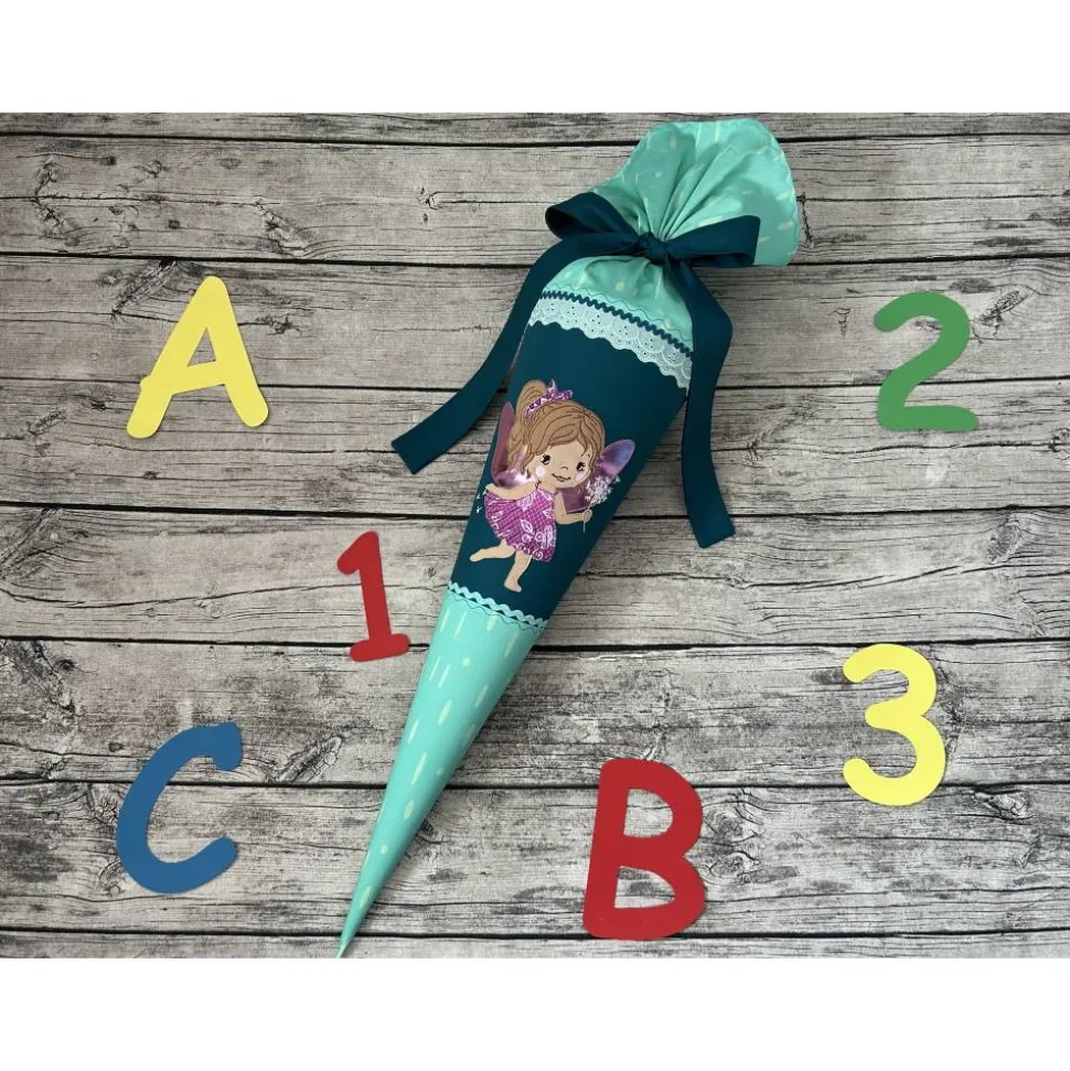 Die Schultüte ist 70cm groß, Plus der Stoff zum verschließen und genäht aus 98% Baumwolle 2%Elastan.
