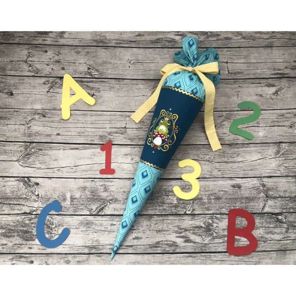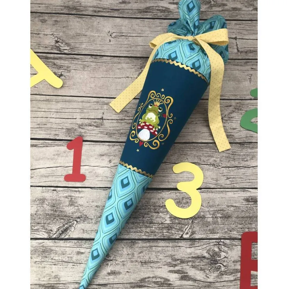 Hier habe ich eine ganz besondere in Türkis- & Petroltönen für euch. Genäht aus schönen Baumwollstoffen, und bestickt mit einem wunderschönen Froschprinz von Zwergenschön, verziert mit kleinen Glitzersteinchen und mit kleinen Goldenen Sternen und Elementen.