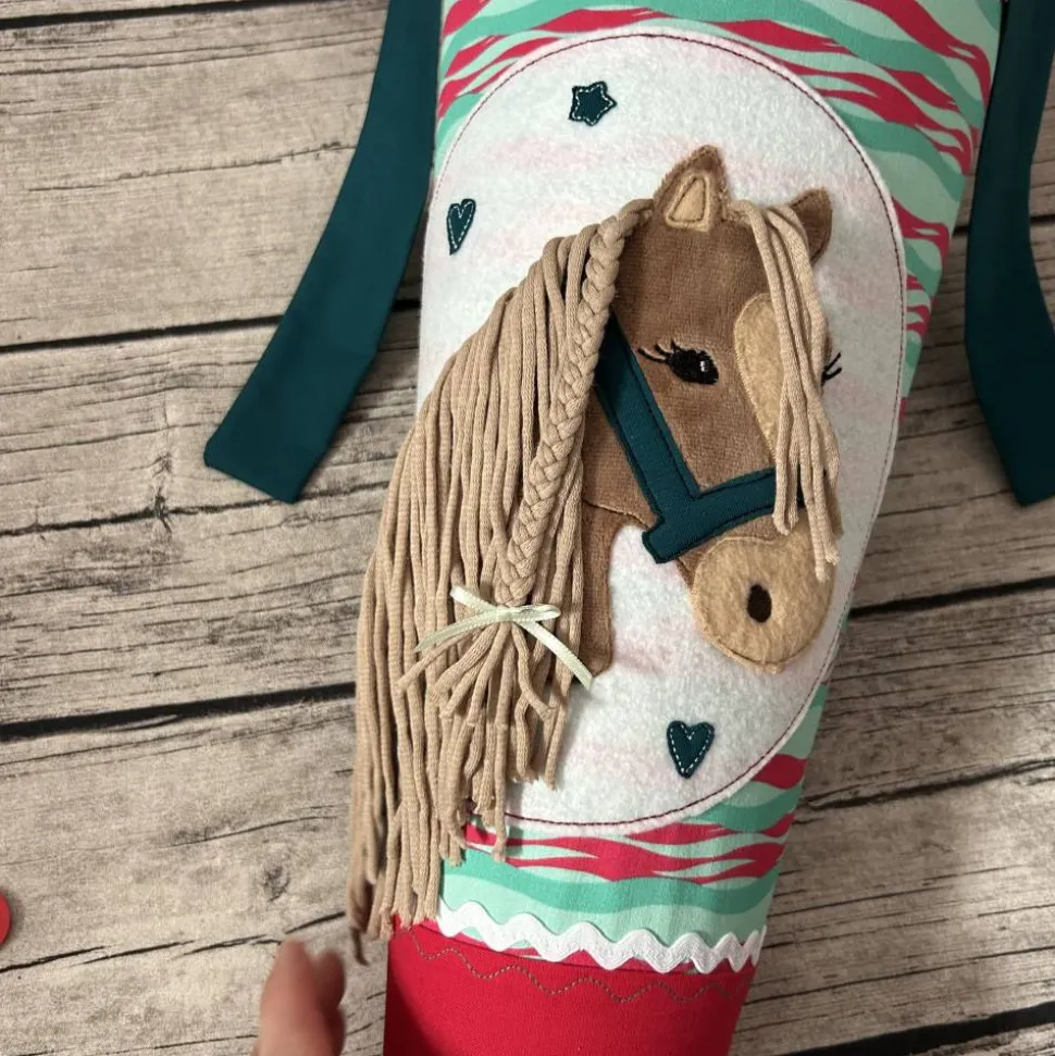 Hier habe ich eine ganz besondere für euch. Genäht aus zauberhaftem Baumwoll-Stoffen in Rot- & Minttönen und bestickt mit einem wunderschönen 3D Pferdekopf mit wuscheliger Mähne.