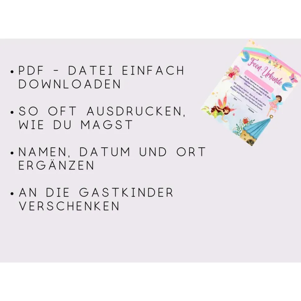 Nach deiner Bestellung steht dir die Urkunde als PDF-Datei im Format DIN A4 sofort zur Verfügung. Du kannst sie so oft ausdrucken, wie du möchtest und als Mitgebsel in die Gasttüten packen. Weiterverkaufen darfst du die Urkunden allerdings nicht.