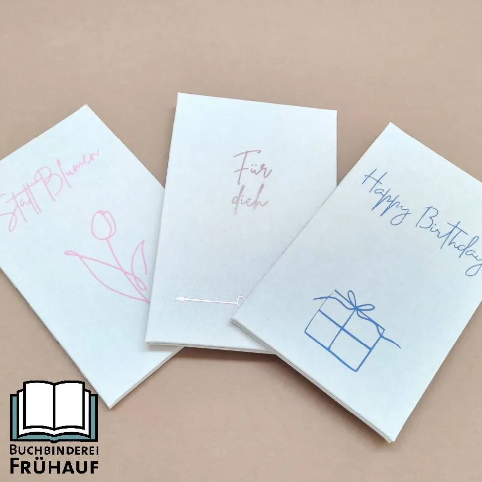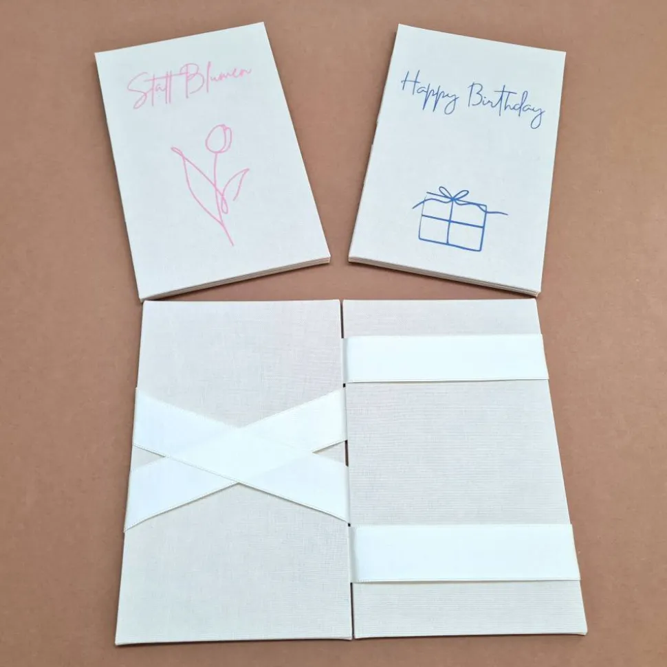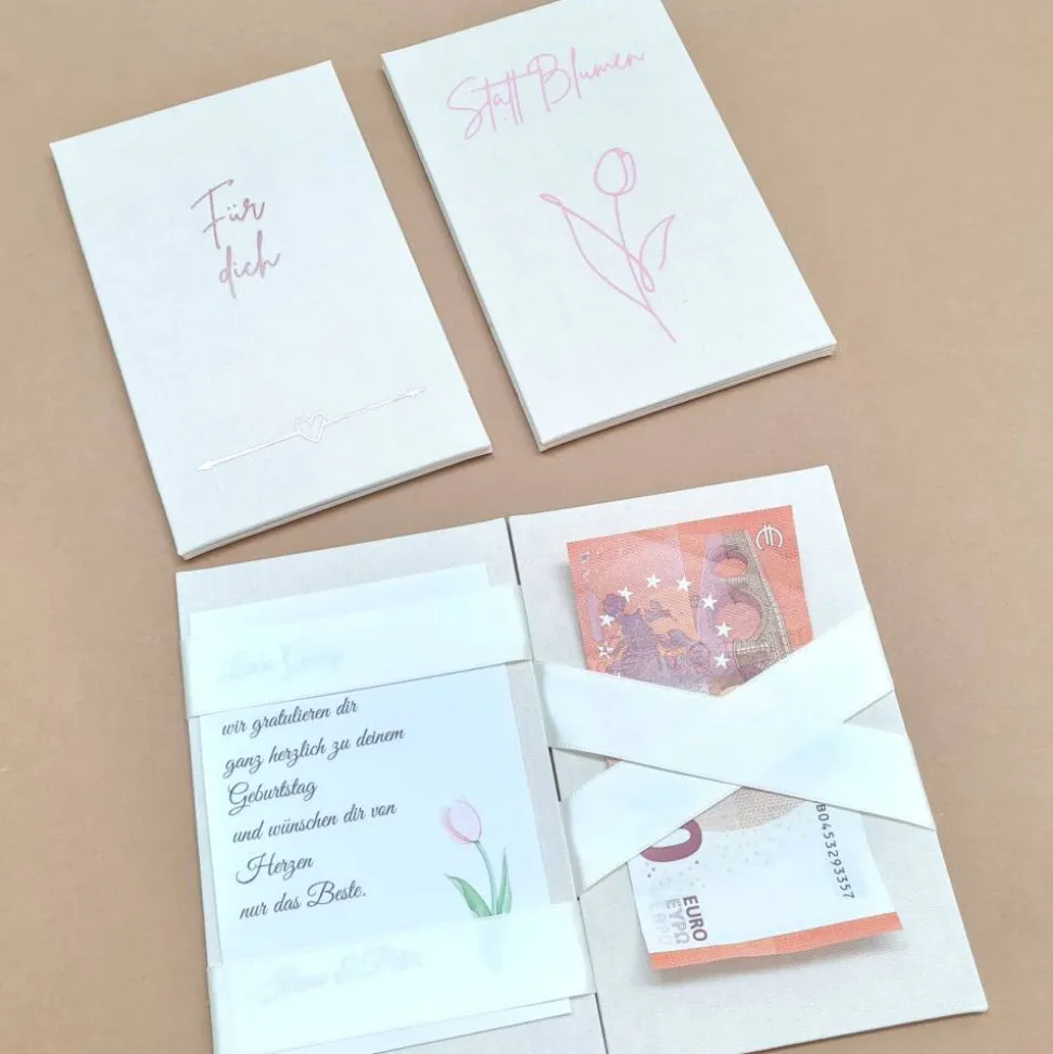 Die Zaubermappe bietet Platz für Geldscheine, persönliche Worte oder Glückwünsche. Sie wird aus 1,5mm Buchbindergraupappe und Schrenzkarton gefertigt, außen mit Iris Buchbinderleinen bezogen. Schriftzug und Motiv bestehen aus hochwertiger Flexfolie: „Für dich“ in glänzendem Rose, „Happy Birthday“ in mattem Blau und „Statt Blumen“ in mattem Rosa.