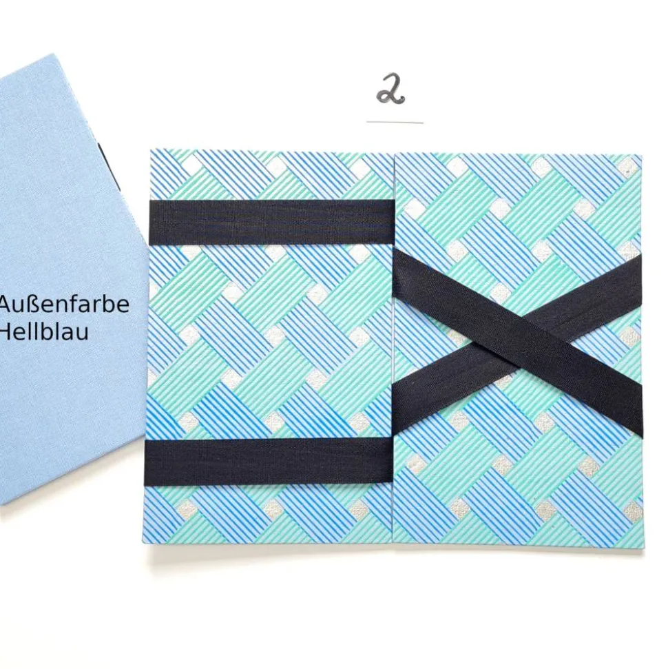 Außen überzogen mit Iris Buchbinderleinen, innen mit wunderschönen Buntpapieren.