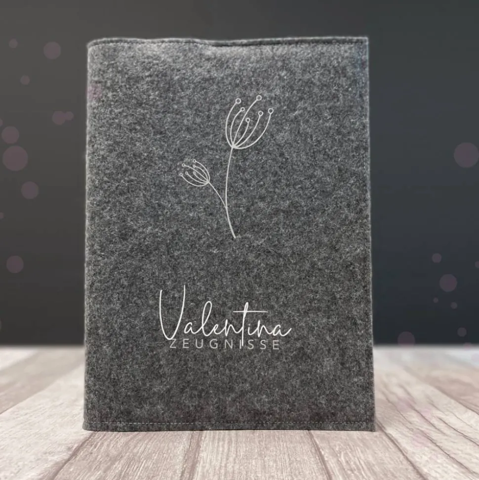 Die edle Zeugnismappe aus Filz bietet dir Platz für bis zu 40 Seiten im Din A4 Format. Du bekommst sie in den Farben Grau oder Anthrazit mit einem einseitig aufgedruckten Design in fünf eleganten Farbkombinationen. Ganz persönlich und unverwechselbar wird die Mappe durch den Aufdruck deines Wunschnamens. Der individuell für dich handgefertigte Filzumschlag enthält eine Verstärkung aus Buchbinderkarton und ein Sichtbuch mit 20 festverschweißten Klarsichthüllen.