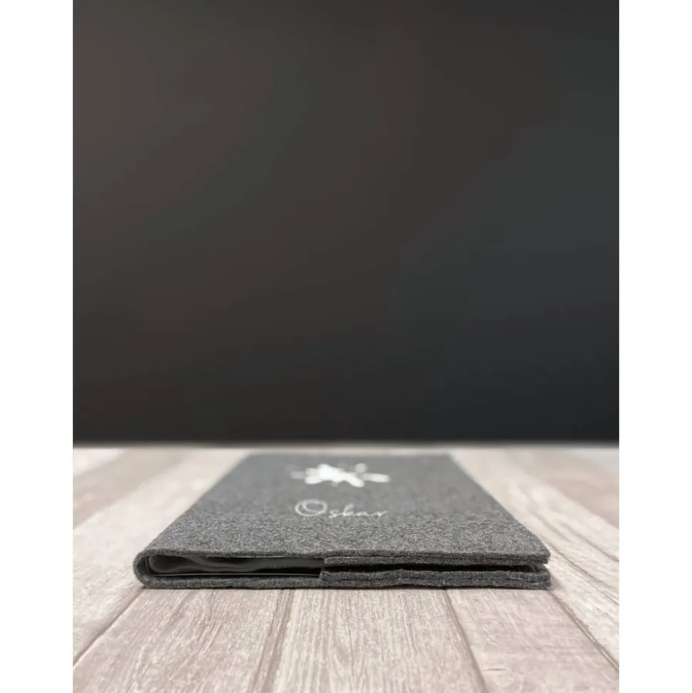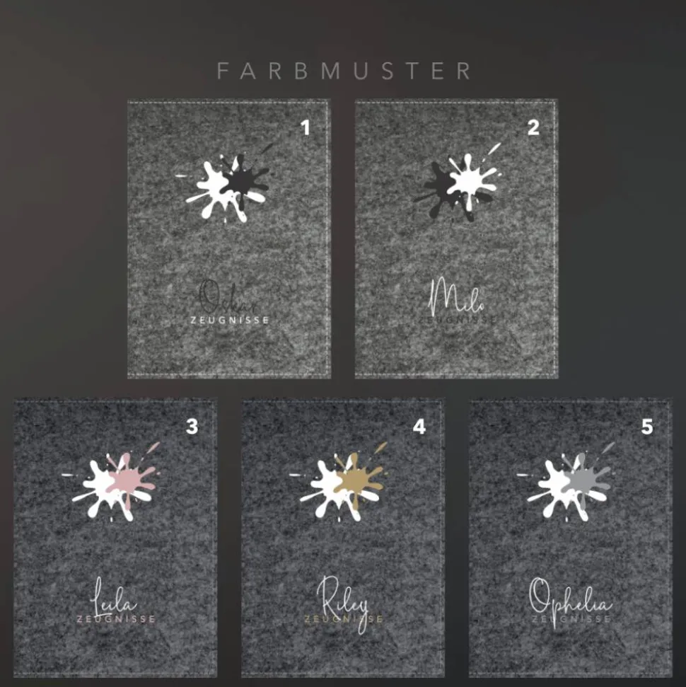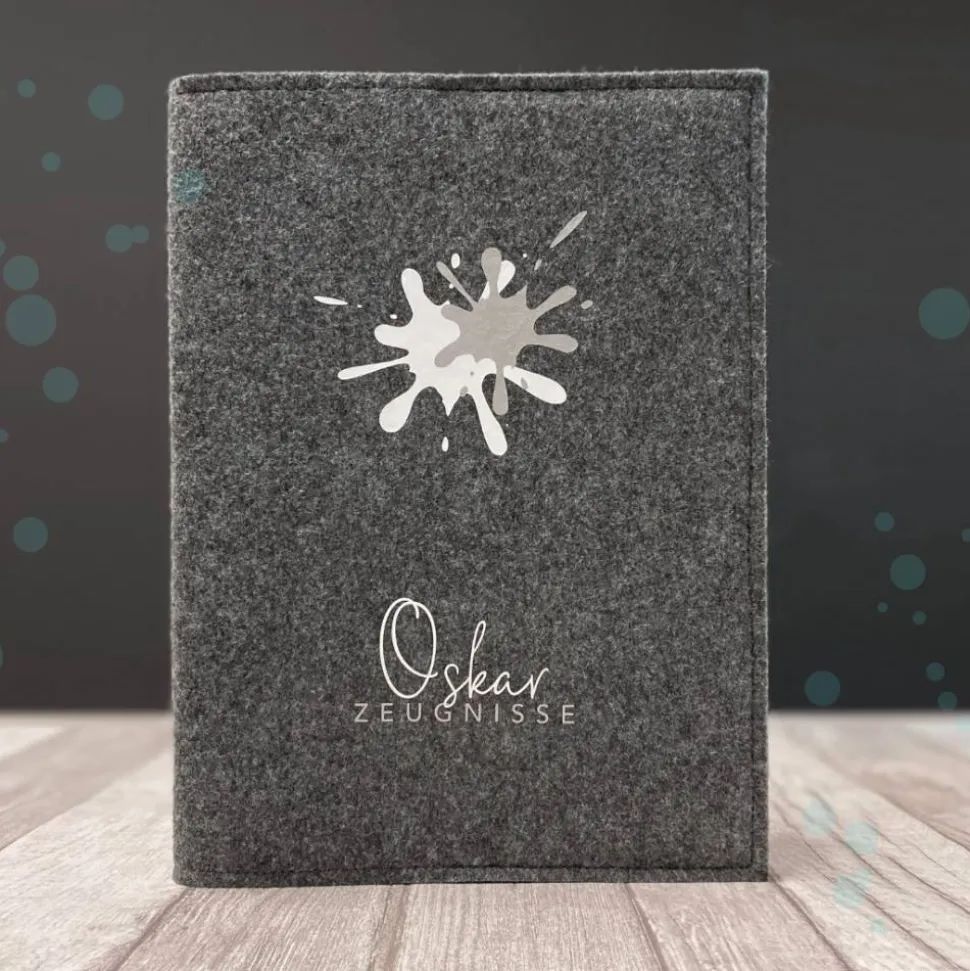 Die edle Zeugnismappe aus Filz bietet dir Platz für bis zu 40 Seiten im Din A4 Format. Du bekommst sie in den Farben Grau oder Anthrazit mit einem einseitig aufgedruckten Design in fünf eleganten Farbkombinationen. Ganz persönlich und unverwechselbar wird die Mappe durch den Aufdruck deines Wunschnamens. Der individuell für dich handgefertigte Filzumschlag enthält eine Verstärkung aus Buchbinderkarton und ein Sichtbuch mit 20 festverschweißten Klarsichthüllen.