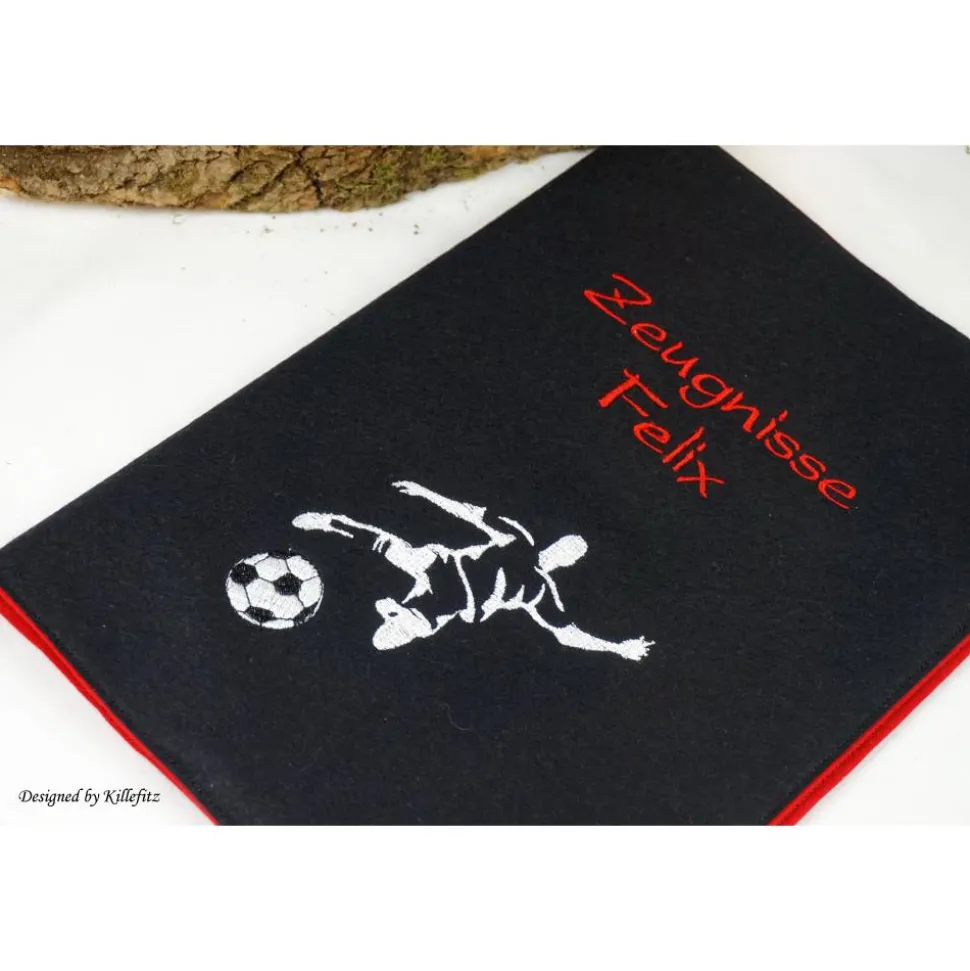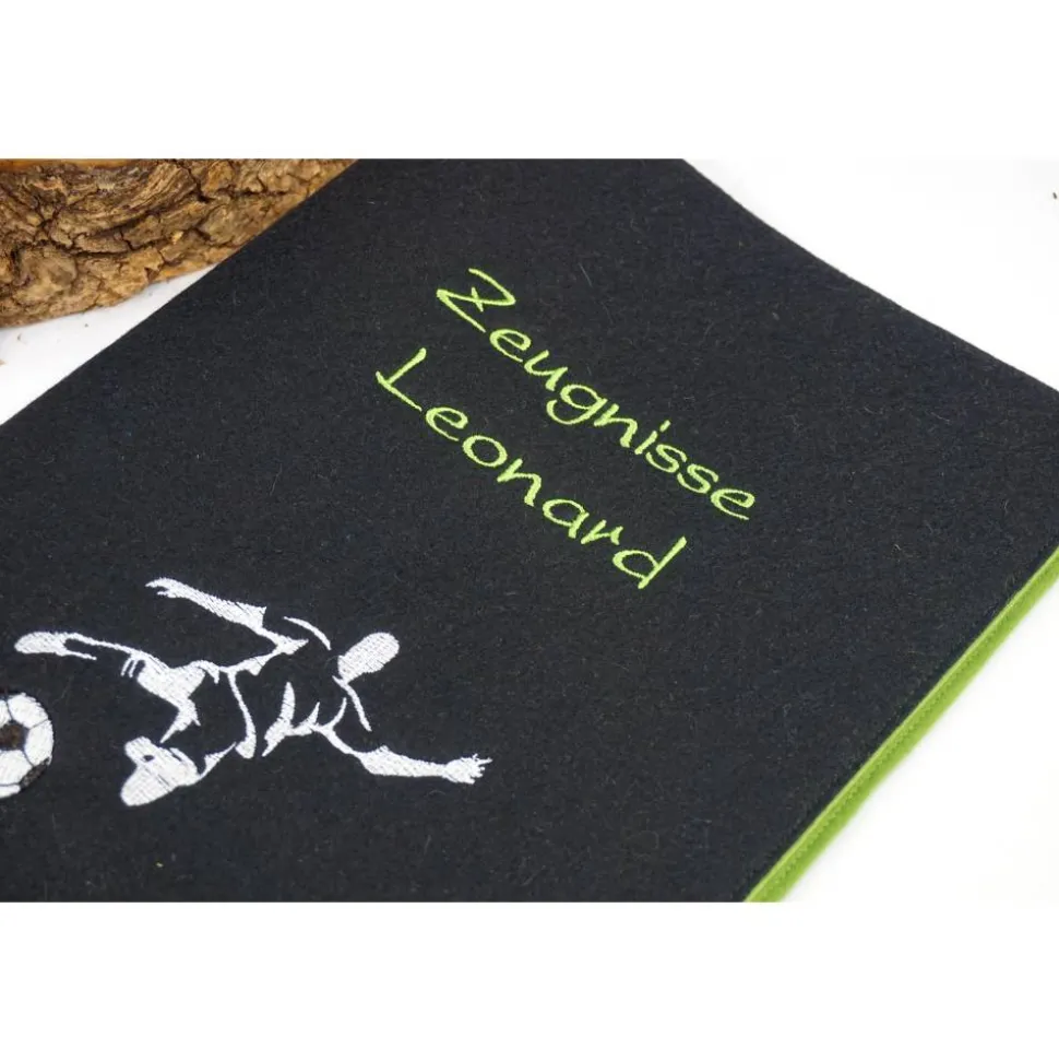Diese hochwertige DIN A4 Zeugnismappe aus schwarzem Filz wird mit dem Namen deines Kindes bestickt und zeigt einen coolen Fußballer. Damit schenkst du nicht nur ein praktisches, sondern auch ein ganz persönliches Erinnerungsstück zum Schulanfang.