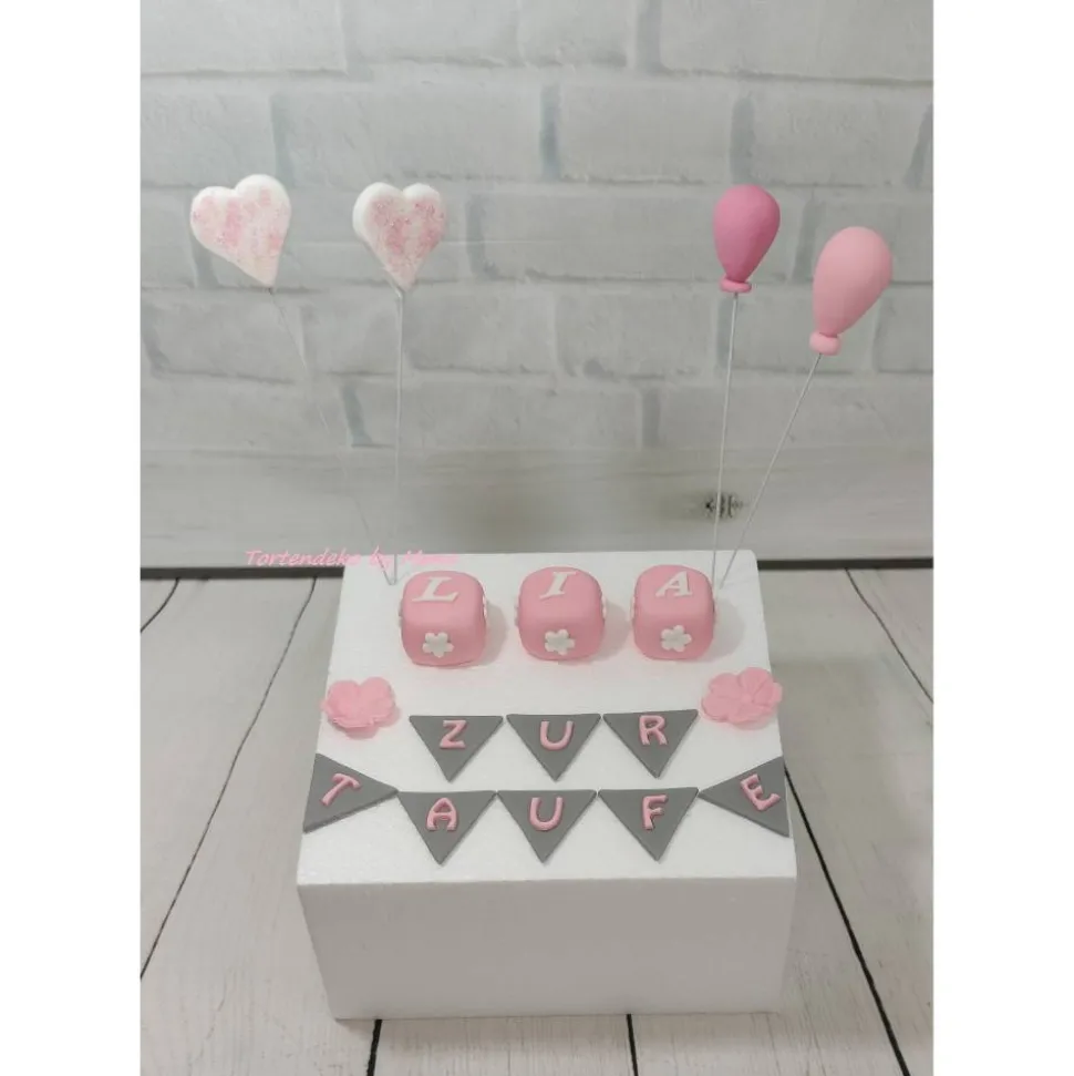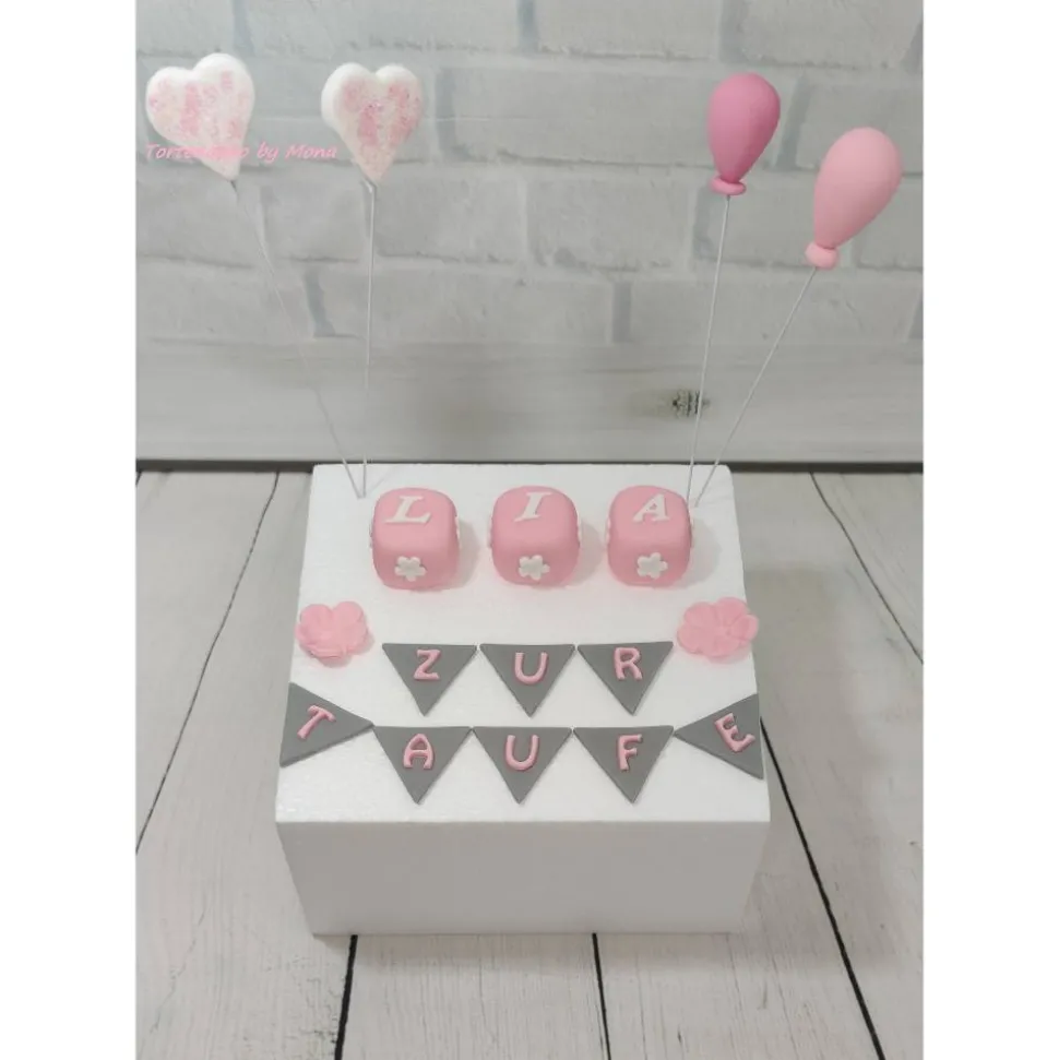 Hier bekommt ihr eine Tortendeko für die Taufe. Natürlich kann ich es auch in anderen Farben fertigen , damit es auch für kleine Jungs passt. Im Angebot enthalten ist die Deko die abgebildet ist ( der Dummy gehört nicht dazu ) Namenswürfel sind 3 Stück enthalten bei mehr benötigten, bitte dazu kaufen.