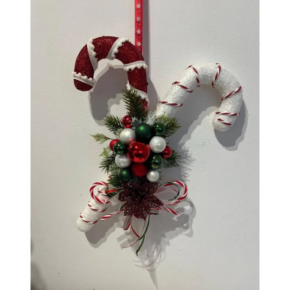 Hier biete ich für die schönste Jahreszeit einen ganz bezaubernden Tür- oder Wandschmuck an, der aus Zuckerstangen, Glaskugeln, künstlicher Tanne und weihnachtlichen Accessoires besteht, den ich mit sehr viel Liebe zum Detail hergestellt habe 🙂