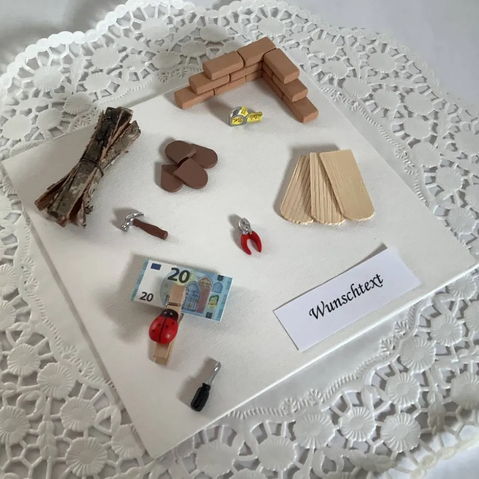 Persönlich wird das Geldgeschenk durch den Wunschtext, der z. B. Für den Hausbau, Zum Richtfest, Zuschuss für euren Umbau, Zur Renovierung oder Für die Häuslebauer lauten kann. So freuen sich Mann, Frau, Mädchen, Junge, Ehepaare und alle, die die eigenen vier Wände neu bauen oder umbauen wollen.