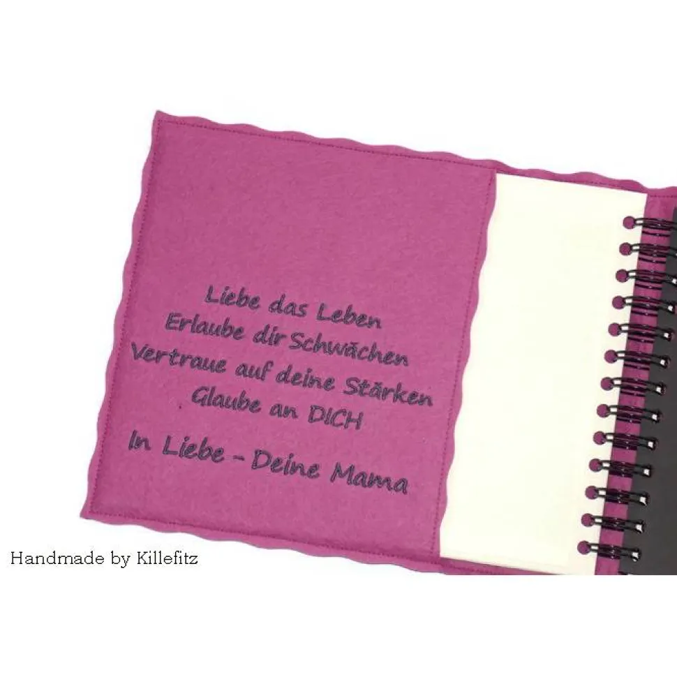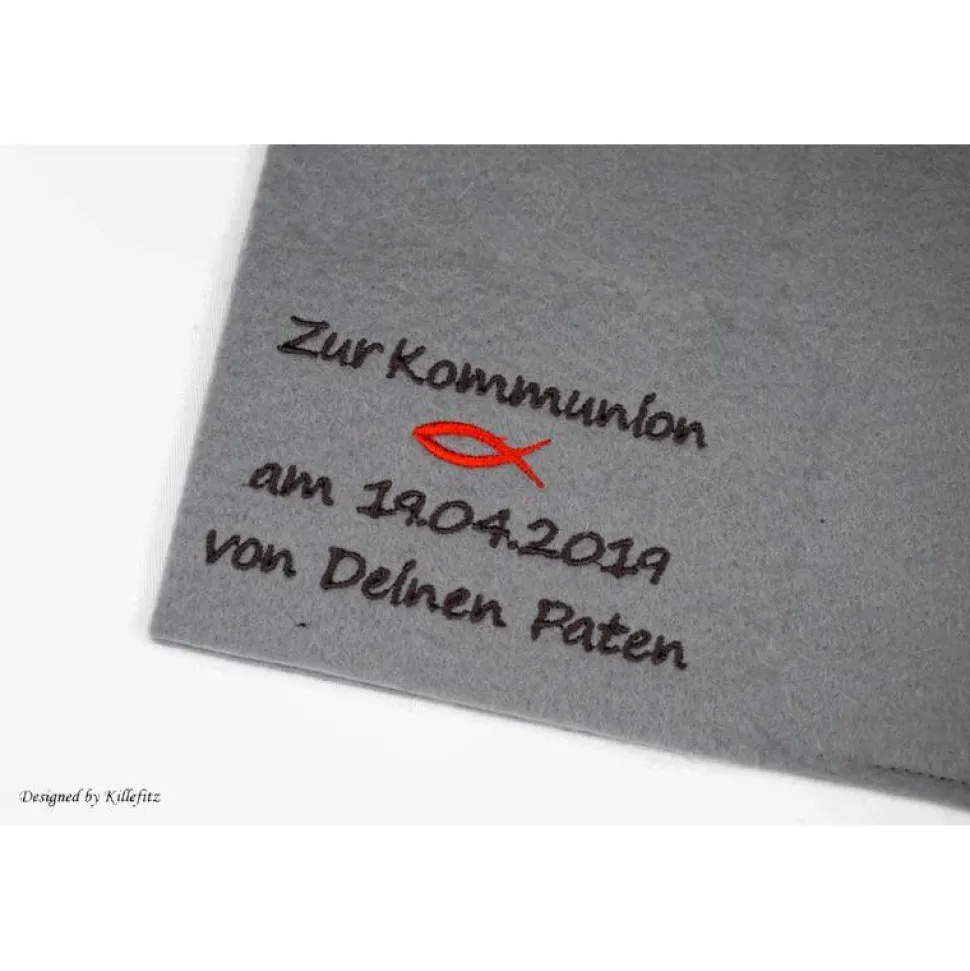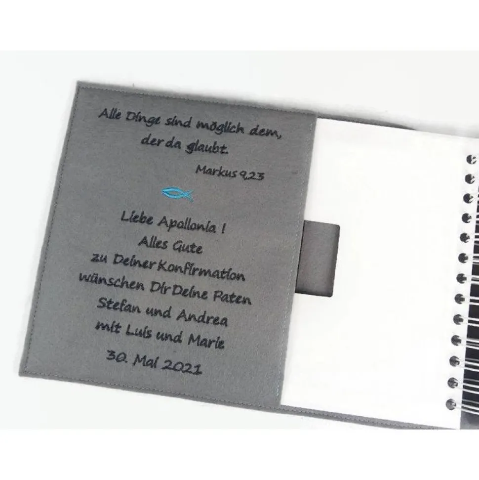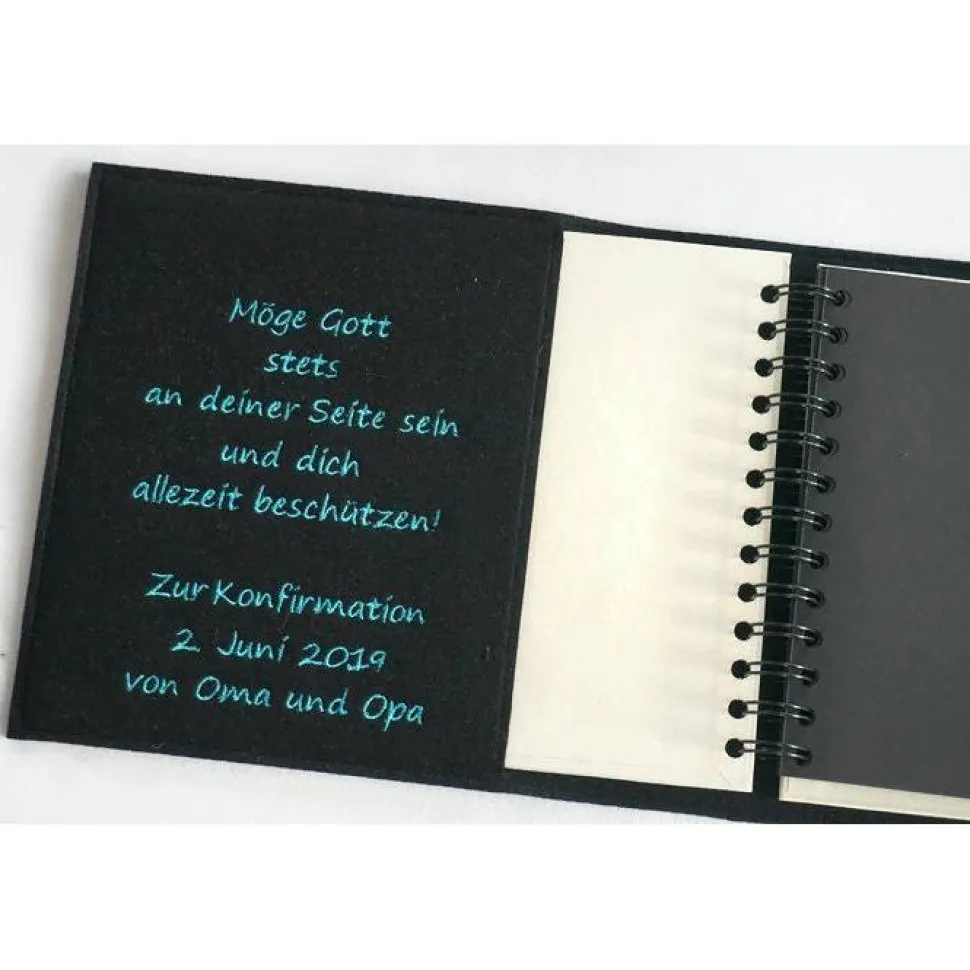 Die Widmung wird innen in den Einschlag, farblich passend zum Innen- und Außenfilz, eingestickt.